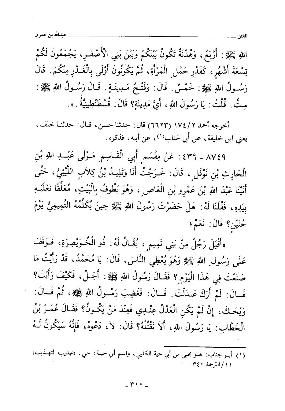٨٧٤٩ - عَنْ مِقْسَمٍ أَبِي الْقَاسِمِ، مَوْلَى عَبْدِ اللهِ بْنِ الْحَارِثِ بْنِ نَوْفَلٍ. قَالَ: خَرَجْتُ أَنَا وَتَلِيدُ بْنُ كِلَابٍ اللَّيْثِيُّ، حَتَّى أَتَيْنَا عَبْدَ اللهِ بْنَ عَمْرِو بْنِ الْعَاصِ، وَهُوَ يَطُوفُ بِالْبَيْتِ، مُعَلِّقًا نَعْلَيْهِ بِيَدِهِ، فَقُلْنَا لَهُ: هَلْ حَضَرْتَ رَسُولَ اللهِ صلى الله عليه وسلم حِينَ يُكَلِّمُهُ التَّمِيمِيُّ يَوْمَ حُنَيْنٍ؟ قَالَ: نَعَمْ؛
