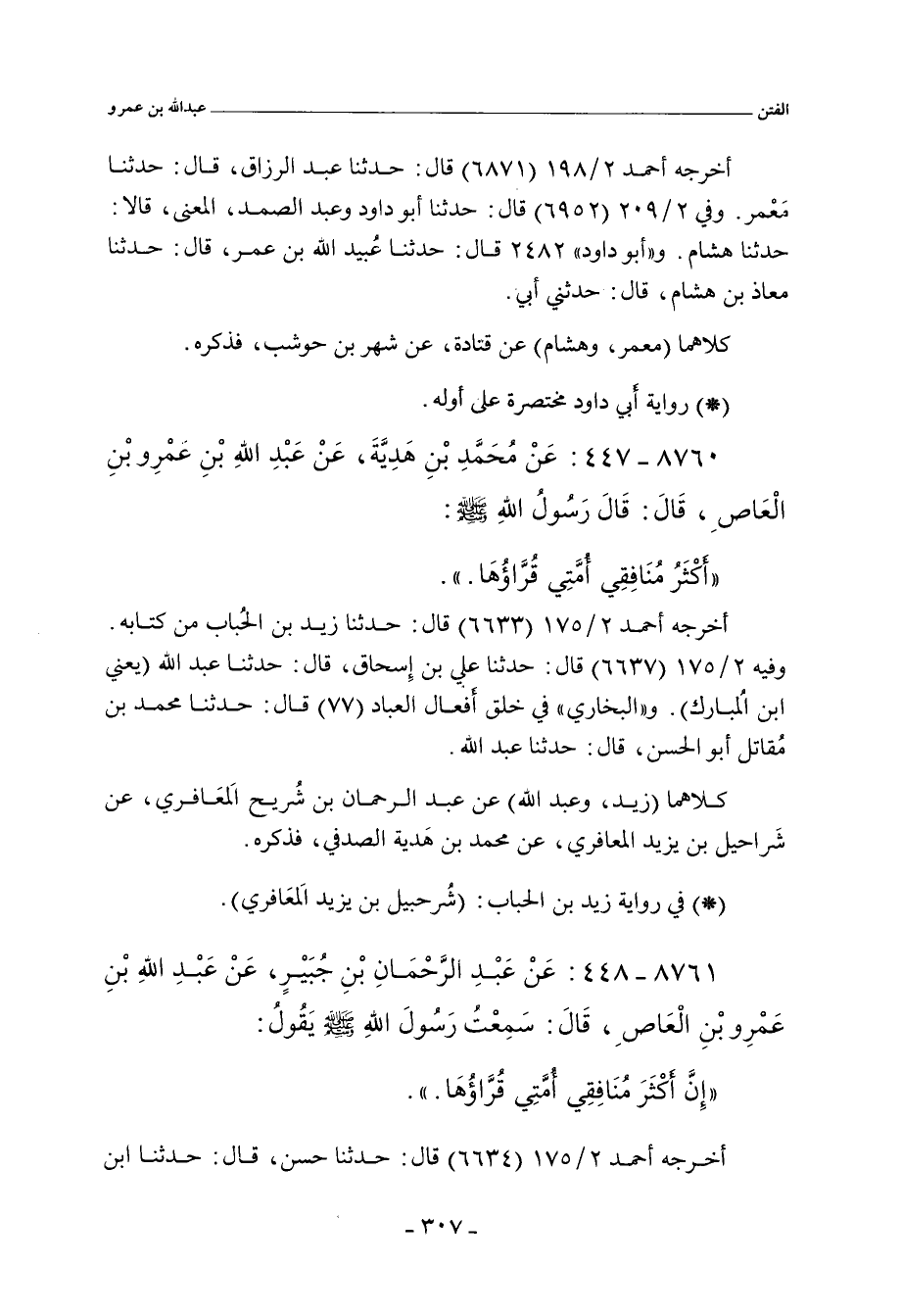 ٨٧٦٠ - عَنْ مُحَمَّدِ بْنِ هَدِيَّةَ، عَنْ عَبْدِ اللهِ بْنِ عمْرِو بْنِ الْعَاصِ. قَالَ: قَالَ رَسُولُ اللهِ صلى الله عليه وسلم: