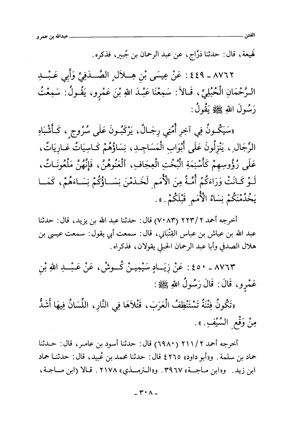 ٨٧٦٢ - عَنْ عِيسَى بْنِ هِلَالٍ الصَّدَفِيِّ، وَأَبِي عَبْدِ الرَّحْمَانِ الْحُبُلِيِّ. قالَا: سَمِعْنَا عَبْدَ اللهِ بْنَ عَمْرٍو، يَقُولُ: سَمِعْتُ رَسُولَ اللهِ صلى الله عليه وسلم لا يَقُولُ: