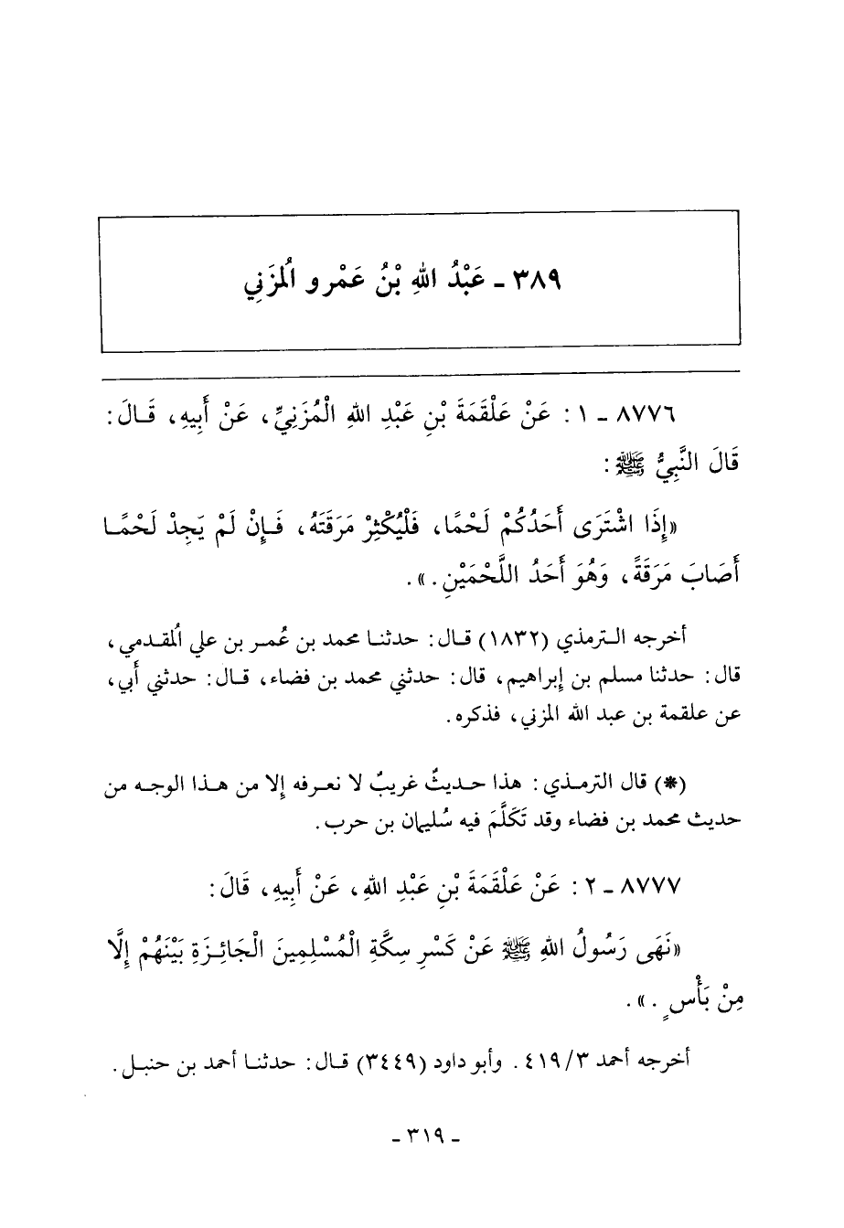 أخرجه الترمزي (١٨٣٢) قال: حدثنا محمد بن عمر بن علي المقدمي، قال: حدثنا مسلم بن إبراهيم، قال حدثني محمد بن فضاء، قال: حدثني أبي، عن علقمة بن عبد الله المزني، فذكره.