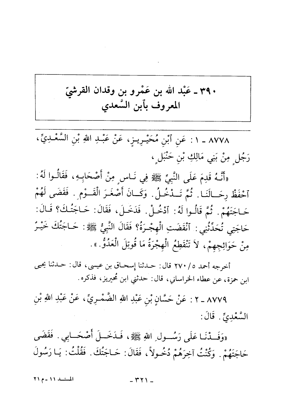 ٨٧٧٩ - عَنْ حَسَّانَ بْنِ عَبْدِ اللَّهِ الضَّمْرِىِّ , عَنْ عَبْدِ اللَّهِ بْنِ السَّعْدِىِّ. قَالَ: