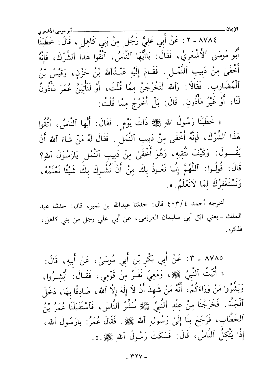 ٨٧٨٤ - عَنْ أبِي عَلِيٍّ رَجُلٍ مِنْ بَنِي كَاهِلٍ، قال: خَطَبَنَا أبُو مُوسَى الأشْعَرِيُّ، فَقال: يَا أيُّهَا النَّاسُ، اتَّقُوا هَذَا الشِّرْكَ، فَإِنَّهُ أخْفَى مِنْ دَبِيبِ النَّمْلِ. فَقَامَ إِلَيْهِ عَبْدُ اللهّ بْنُ حَزْنٍ، وَقَيْسُ بْنُ الْمُضَارِبِ. فَقالا: وَالله لَتَخْرُجَنَّ مِمَّا قُلْتَ، أوْ لَنَأْتِيَنَّ عُمَرَ مَأْذُونٌ لَنَا، أوْ غَيْرُ مَأْذُونٍ. قال: بَلْ أخْرُجُ مِمَّا قُلْتُ: