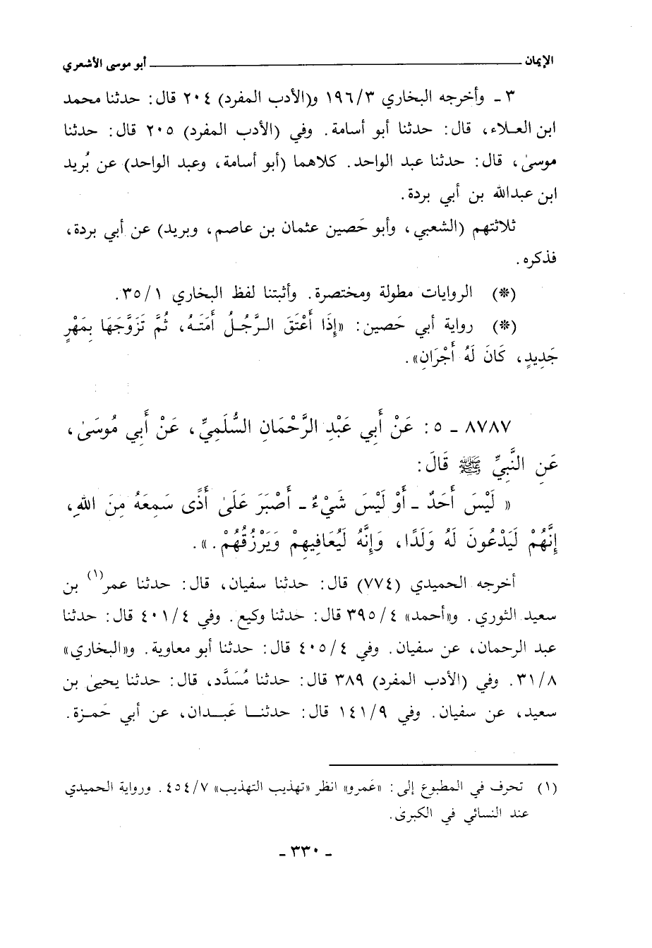 أخرجه الحميدىِ (٧٧٤) قال: حدَّثنا سفيان، قال: حدَّثنا عمر بن سعيد الثوريَ. و) أحمد (٤/ ٣٩٥ قال: حدَّثنا وكيع. وفي ٤/ ٤٠١ قال: حدَّثنا عبد الرحمن، عن سفيان. وفي ٤/ ٤٠٥ قال: حدَّثنا أبو معاوية. و) البخاريَ (٨/ ٣١. وفي "الأدب المفرد" ٣٨٩ قال: حدَّثنا مُسَدَّد، قال: حدَّثنا يحيى بن سعيد، عن سفيان. وفي ٩/ ١٤١ قال: حدَّثنا عَبدان، عن أبي حَمزة.