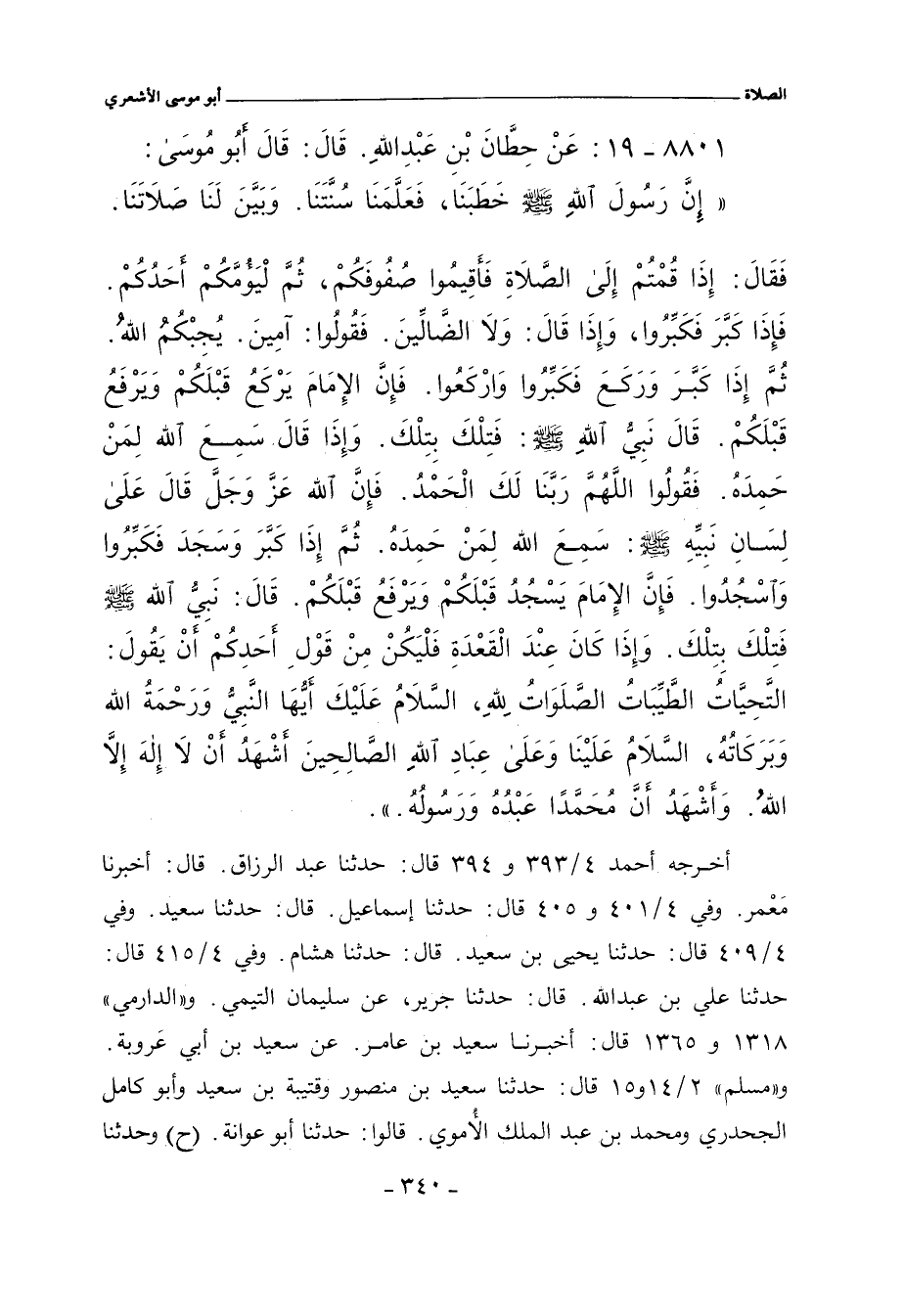 إِنَّ رَسُولَ الله صلى الله عليه وسلم خَطَبَنَا، فَعَلَّمَنَا سُنَّتَنَا. وَبَيَّنَ لَنَا صَلَاتَنَا. فَقال: إِذَا قُمْتُمْ إِلَى الصَّلَاةِ فَأَقِيمُوا صُفُوفَكُمْ، ثُمَّ لْيَؤمَّكُمْ أحَدكُمْ. فَإِذَا كَبَّرَ فَكَبِّرُوا، وَإِذَا قال: وَلَا الضَّالِّينَ. فَقُولُوا: آمِينَ. يُجِبْكُمُ الله. ثُمَّ إِذَا كَبَّرَ وَرَكَعَ فَكَبِّرُوا وَارْكَعُوا. فَإِنَّ الإِمَامَ يَرْكَعُ قَبْلَكُمْ وَيَرْفَعُ قَبْلَكُمْ. قال نَبِيُّ الله صلى الله عليه وسلم: فَتِلْكَ بِتِلْكَ. وَإِذَا قال سَمِعَ الله لِمَنْ حَمِدَهُ. فَقُولُوا اللهمَّ رَبَّنَا لَكَ الْحَمْدُ. فَإِنَّ الله عز وَجَلَّ قال عَلَى لِسَانِ نَبِيِّهِ صلى الله عليه وسلم: سَمِعَ الله لِمَنْ حَمِدَهُ. ثُمَّ إِذَا كَبَّرَ وَسَجَدَ فَكَبِّرُوا وَاسْجُدُوا. فَإِنَّ الإِمَامَ يَسْجُدُ قَبْلَكُمْ وًيرْفَعُ قَبْلَكُمْ. قال: نَبِيُّ الله صلى الله عليه وسلم فَتِلْكَ بِتِلْكَ. وَإِذَا كَانَ عِنْدَ الْقَعْدَهِ فَلْيَكُنْ مِنْ قَوْلِ أَحَدِكُمْ أَنْ يَقُولَ: التَّحِيَّاتُ الطَّيِّبَاتُ الصَّلَوَاتُ للهِ، السَّلَامُ عَلَيْكَ أيُّهَا النَّبِيُّ وَرَحْمَةُ الله وَبَرَكَاتُهُ، السَّلَامُ عَلَيْنَا وَعَلَى عِبَادِ الله الصَّالِحِينَ أَشْهَدُ أَنْ لا إِله إِلَاّ الله. وَأَشْهَدُ أَنَّ مُحَمَّدًا عَبْدُهُ وَرَسُولُهُ.