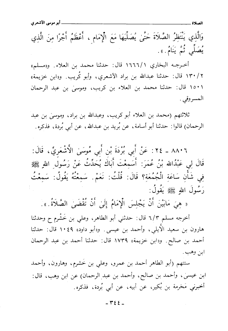 أخرجه البخاري ١/ ١٦٦ قال: حدَّثنا محمد بن العلاء. و) مسلم (٢/ ١٣، قال: حدَّثنا عبد الله بن براد الأشعري، وأبو كُريب. و) ابن خزيمة (١٥٠١ قال: حدَّثنا محمد بن العلاء بن كريب، وموسى بن عبد الرحمن المسروقي.