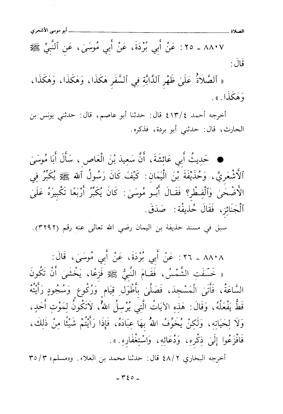 حَدِيثُ أَبِي عَائِشَة، أَنَّ سعِيدَ بْنَ الْعَاصِ، سَأَلَ أَبَا مُوسَى الأشْعَرِيَّ، وَحُذَيْفَةَ بْنَ الْيَمَانِ: كَيْفَ كَانَ رَسُولُ الله صلى الله عليه وسلميُكَبِّرُ فِي الأضْحَى وَآلْفِطْرِ؟ فَقال أبو موسى: كَانَ يُكَبِّرُ أَرْبَعًا تَكْبِيرَهُ عَلَى الْجَنَائِزِ، فَقال حُذيفْة: صَدَقَ.