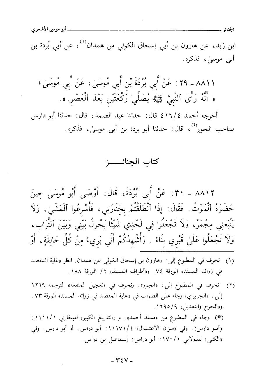 أخرجه أحمد ٤/ ٤١٦ قال: حدَّثنا عبد الصمد، قال: حدَّثنا أبو دارس صاحب الحور، قال: حدَّثنا أبو بردة بن أبي موسى، فذكره.