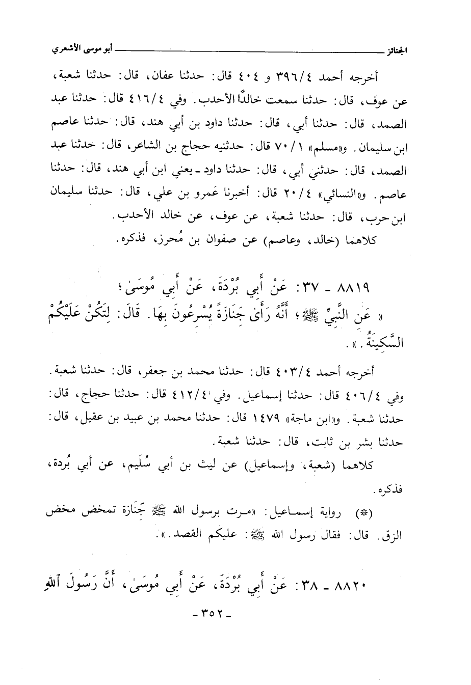 أخرجه أحمد ٤/ ٣٩٦ و ٤٠٤ قال: حدَّثنا عفان، قال: حدَّثنا شعبة، عن عوف، قال: حدَّثنا سمعت خالدا الأحدب. وفي ٤/ ٤١٦ قال: حدَّثنا عبد الصمد، قال: حدَّثنا أبي، قال: حدَّثنا داود بن أبي هند، قال: حدَّثنا عاصم بن سليمان. و) مسلم (١/ ٧، قال: حدثنيه حجاج بن الشاعر، قال: حدَّثنا عبد الصمد، قال: حدثني أبي، قال: حدَّثنا داود - يعني ابن أبي هند، قال: حدَّثنا عاصم. و) النسائي (٤/ ٢، قال: أَخْبَرنا عَمرو بن علي، قال: حدَّثنا سليمان بن حرب، قال: حدَّثنا شعبة، عن عوف، عن خالد الأحدب.