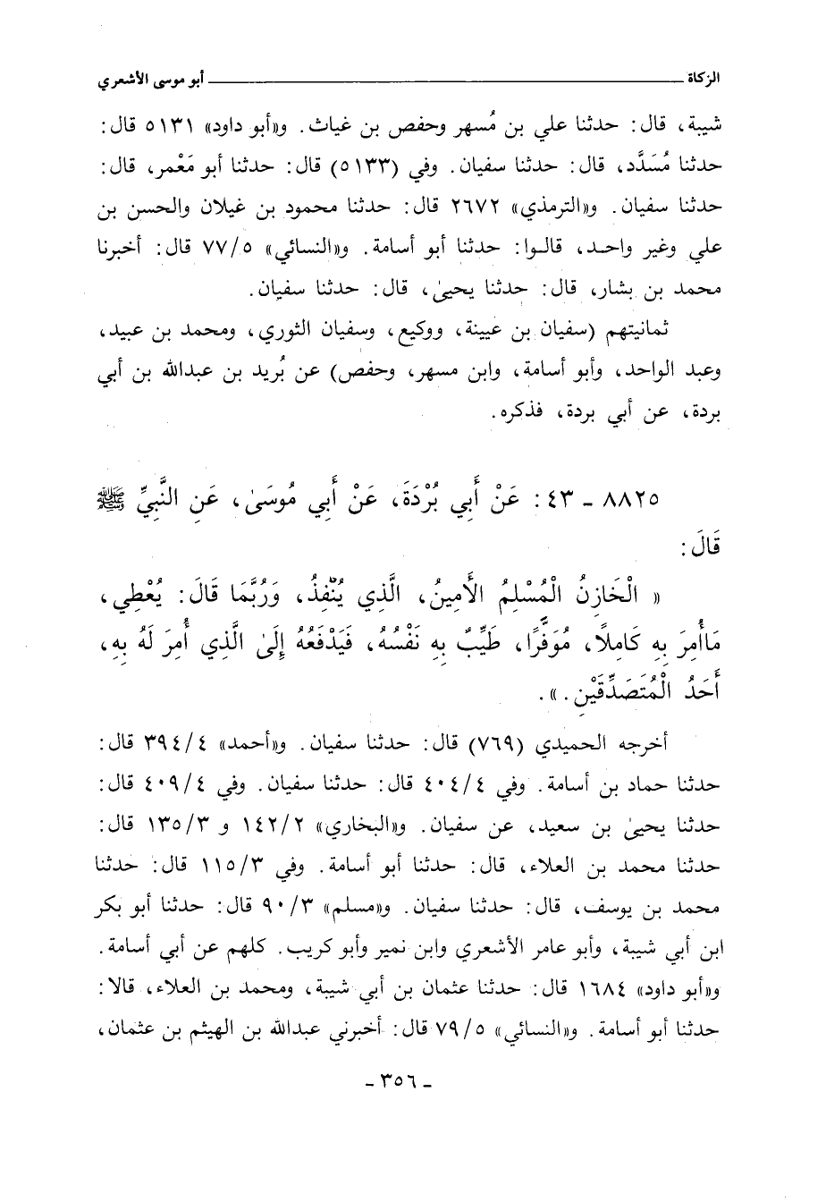 أخرجه الحميدي (٧٦٩) قال: حدَّثنا سفيان. وأحمد ٤/ ٣٩٤ قال: حدَّثنا حماد بن أُسامة. وفى ٤/ ٤٠٤ قال: حدَّثنا سفيان. وفى ٤/ ٤٠٩ قال: حدَّثنا يحيى بن سعيد، عن سفيان. والبخاري ٢/ ١٤٢ و ٣/ ١٣٥ قال: حدَّثنا محمد بن العلاء، قال: حدَّثنا أبو أُسامة. وفي ٣/ ١١٥ قال: حدَّثنا محمد بن يوسف، قال: حدَّثنا سفيان. ومسلم ٣/ ٩، قال: حدَّثنا أبو بكر بن أبي شيبة، وأبو عامر الأشعري وابن نمير وأبو كريب. كلهم عن أبي أُسامة. وأبو داود ١٦٨٤ قال: حدَّثنا عثمان بن أبي شيبة، ومحمد بن العلاء، قالا: حدَّثنا أبو أُسامة. والنسائي ٥/ ٧٩ قال: أخبرني عبد الله بن الهيثم بن عثمان،