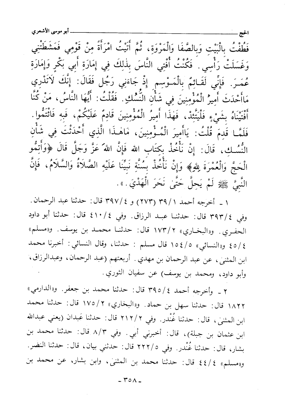فَطُفْتُ بِالْبَيْتِ وَبِالصَّفَا وَالْمَرْوَةِ، ثُمَّ أَتَيْتُ امْرَاةً مِنْ قَوْمِي فَمَشَطَتْنِي وَغَسَلَتْ رَأْسِي. فَكُنْتُ أُفْتِي النَّاسَ بِذلِكَ فِي إِمَارَةِ أَبِي بَكْرٍ وَإِمَارَةِ عُمَرَ. فَإِنِّي لَقَائِمٌ بِالْمَوْسِمِ إِذْ جَاءَنِي رَجُل فَقال: إِنَّكَ لاتَدْرِي مَا أحْدَثَ أَمِيرُ الْمُؤْمِنِينَ فِي شَأْنِ النُّسُكِ. فَقُلْتُ: أيُّهَا النَّاسُ، مَنْ كُنَّا أفْتَيْنَاهُ بِشَيْءٍ فَلْيَتَّئِدْ، فَهذَا أَمِيرُ الْمُؤْمِنِينَ قَادِمٌ عَلَيْكُم، فَبِهِ فَأتَمُّوا. فَلَمَّا قَدِمَ قُلْتُ: يَا أَمِيرَ الْمُؤْمِنِينَ، مَاهذَا الًّذِي أَحْدَثْتَ فِي شَأنِ النُّسُكِ، قال: إِنْ نَأْخُذْ بكِتَابِ اللهّ فَإِنَّ اللهَ عَزَّ وَجَلَّ قال (وَأَتِمُّو الْحَجَّ وَألْعُمْرَةَ لله) وَإِنْ نَأخُذْ بِسُنَّةِ نَبِيِّنَا عَلَيْهِ ألصلاةُ وَالسَّلَامُ، فَإِنَّ النَّبِيَّ صلى الله عليه وسلم لَمْ يَحِلَّ حَتَّى نَحَرَ الْهَدْيَ.