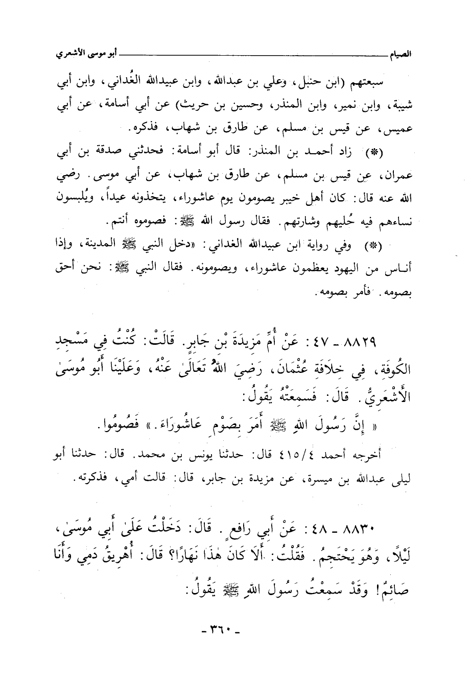 - زاد أحمد بن المنذر: قال أبو أسامة: فحدثني صدقة بن أبي عمران، عن قيس بن مسلم، عن طارق بن شهاب، عن أبي موسى. رضي الله عنه قال: كان أهل خيبر يصومون يوم عاشوراء، يتخذونه عيدا، وُيلبسون نساءهم فيه حُليهم وشارتهم. فقال رسول الله صلى الله عليه وسلم: فصوموه أنتم.