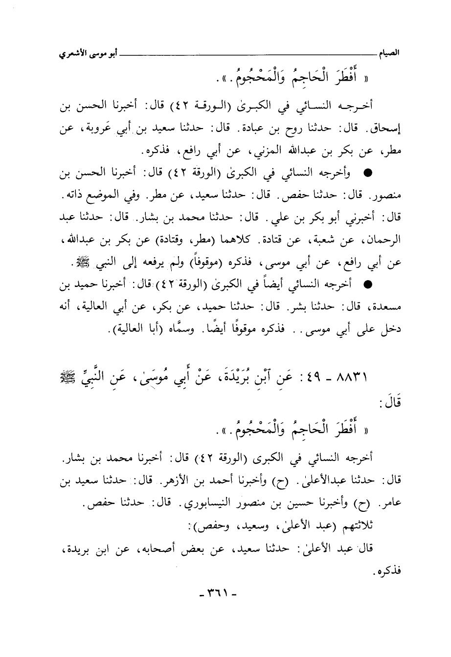 - وأخرجه النسائي في "الكبرى" (الورقة ٤٢) قال: أَخْبَرنا الحسن بن منصور. قال: حدَّثنا حفص. قال: حدَّثنا سعيد، عن مطر. وفي الموضع ذاته. قال: أخبرني أبو بكر بن علي. قال: حدَّثنا محمد بن بشار. قال: حدَّثنا عبد الرحمن، عن شعبة، عن قتادة. كلاهما (مطر، وقتادة) عن بكر بن عبد الله، عن أبي رافع، عن أبي موسى، فذكره (موقوفًا) ولم يرفعه إلى النبي صلى الله عليه وسلم