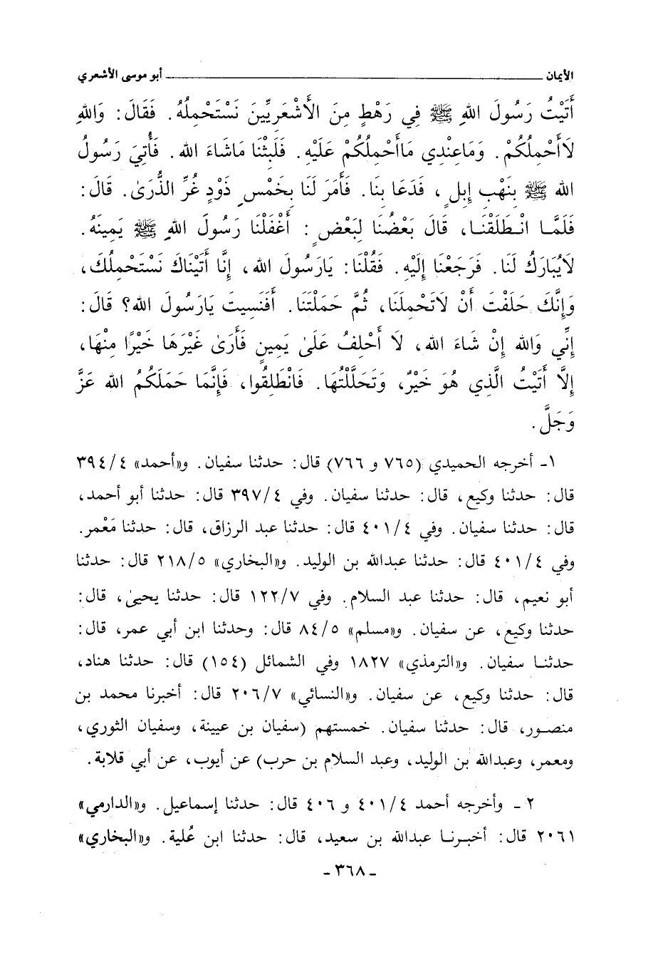 أَتَيْتُ رَسُولَ الله صلى الله عليه وسلم فِي رَهْطٍمِنَ الأَشْعَرِيِّينَ نَسْتَحْمِلُهُ. فَقال: وَاللهِ لَا أَحْمِلُكُمْ. وَمَاعِنْدِي مَا أَحْمِلُكُمْ عَلَيْهِ. فَلَبِثْنَا مَاشَاءَ الله. فَأُتِيَ رَسُولُ الله صلى الله عليه وسلم بِنَهْب إِبِلٍ، فَدَعَا بِنَا. فَأمَرَ لَنَا بِخَمْسِ ذَوْدٍ غُرِّ الذُّرَى. قال: فَلَمَّا انْطَلَقْنًا، قال بَعْضُنَا لِبَعْضٍ: أَغْفَلْنَا رَسُولَ الله صلى الله عليه وسلم يَمِينَهُ. لَا يُبَارَكُ لَنَا. فَرَجَعْنَا إِلَيْهِ. فَقُلْنَا: يَارَسُولَ الله، إِنَّا أَتَيْنَاكَ نَسْتَحْمِلُكَ، وَإِنَّكَ حَلَفْتَ أَنْ لَاتَحْمِلَنَا، ثُمَّ حَمَلْتَنَا. أَفَنَسِيتَ يَارَسُولَ الله؟ قال: إِنِّي وَالله إِنْ شَاءَ الله، لَا أَحْلِفُ عَلَى يَمِينٍفَأَرَى غَيْرَهَا خَيْرًا مِنْهَا، إلَاّ أَتَيْتُ الَّذِي هُوَ خَيْرٌ، وَتَحَلَّلْتُهَا. فَانْطَلِقُوا، فَإِنَّمَا حَمَلَكُمُ الله عَزَّ وَجَلَ.