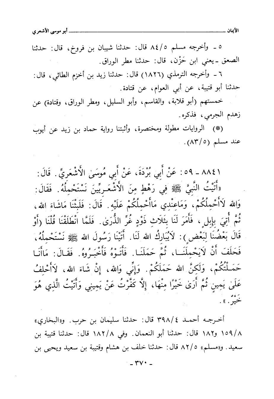 أَتَيْتُ النَّبِيَّ صلى الله عليه وسلم في رَهْطٍ مِنَ الأَشْعَرِيِّينَ نَسْتَحْمِلُهُ. فَقال: وَالله لَا أَحْمِلُكُمْ، وَمَا عِنْدِي مَا أَحْمِلُكُمْ عَلَيْهِ. قال: فَلَبِثْنَا مَا شَاءَ الله، ثُمَّ أتِيَ بِإِبِلٍ، فَأَمَرَ لَنَا بِثَلَاثِ ذَوْدٍ غُرِّ الذُّرَى. فَلَمَّا انْطَلَقْنَا قُلْنَا (أَوْ قال بَعْضُنَا لِبَعْضٍ): لَا يُبَارِكُ الله لَنَا. أَتَيْنَا رَسُولَ الله صلى الله عليه وسلم نَسْتَحْمِلُهُ، فَحَلَفَ أَنْ لَا يَحْمِلَنَا، ثُمَّ حَمَلَنَا. فَأتَوْهُ فَأَخْبَرُوهُ. فَقال: مَا أنَا حَمَلْتُكُمْ، وَلَكِنَّ الله حَمَلَكُمْ. وَإِنِّي وَالله، إِنْ شَاءَ الله، لَا أَحْلِفُ عَلَى يَمِينٍثُمَّ أرَى خَيْرًا مِنْهَا، إِلَاّ كَفَّرْتُ عَنْ يَمِينِي وَأتَيْتُ الَّذِي هُوَ خَيْرٌ.
