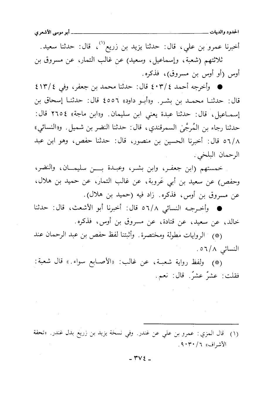 خمستهم (ابن جعفر، وابن بشر، وعبدة بن سليمان، والنضر، وحفص) عن سعيد بن أبي عَروبة، عن غالب التمار، عن حميد بن هلال، عن مسروق بن أوس، فذكره. زاد فيه (حميد بن هلال.