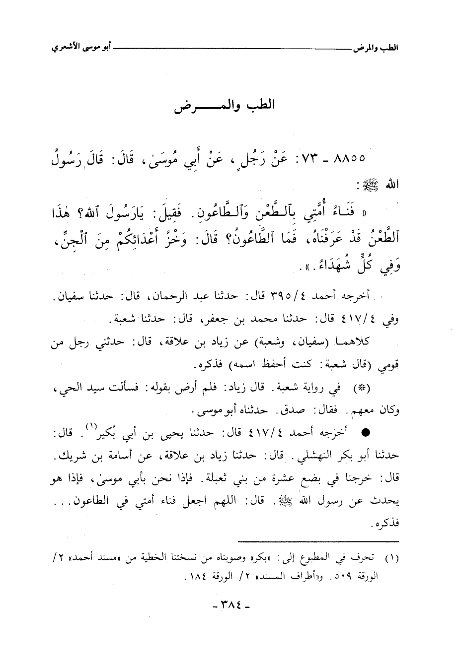 أخرجه أحمد ٤/ ٤١٧ قال: حدَّثنا يحيى بن أبي بُكير. قال: حدَّثنا أبو بكر اللهشلي. قال: حدَّثنا زياد بن علاقة، عن أُسامة بن شريك. قال: خرجنا في بضع عشرة من بني ثعبلة. فإذا نحن بأبي موسى، فإذا هو يحدث عن رسول الله صلى الله عليه وسلم. قال: اللهم اجعل فناء أمتي في الطاعون.، فذكره.