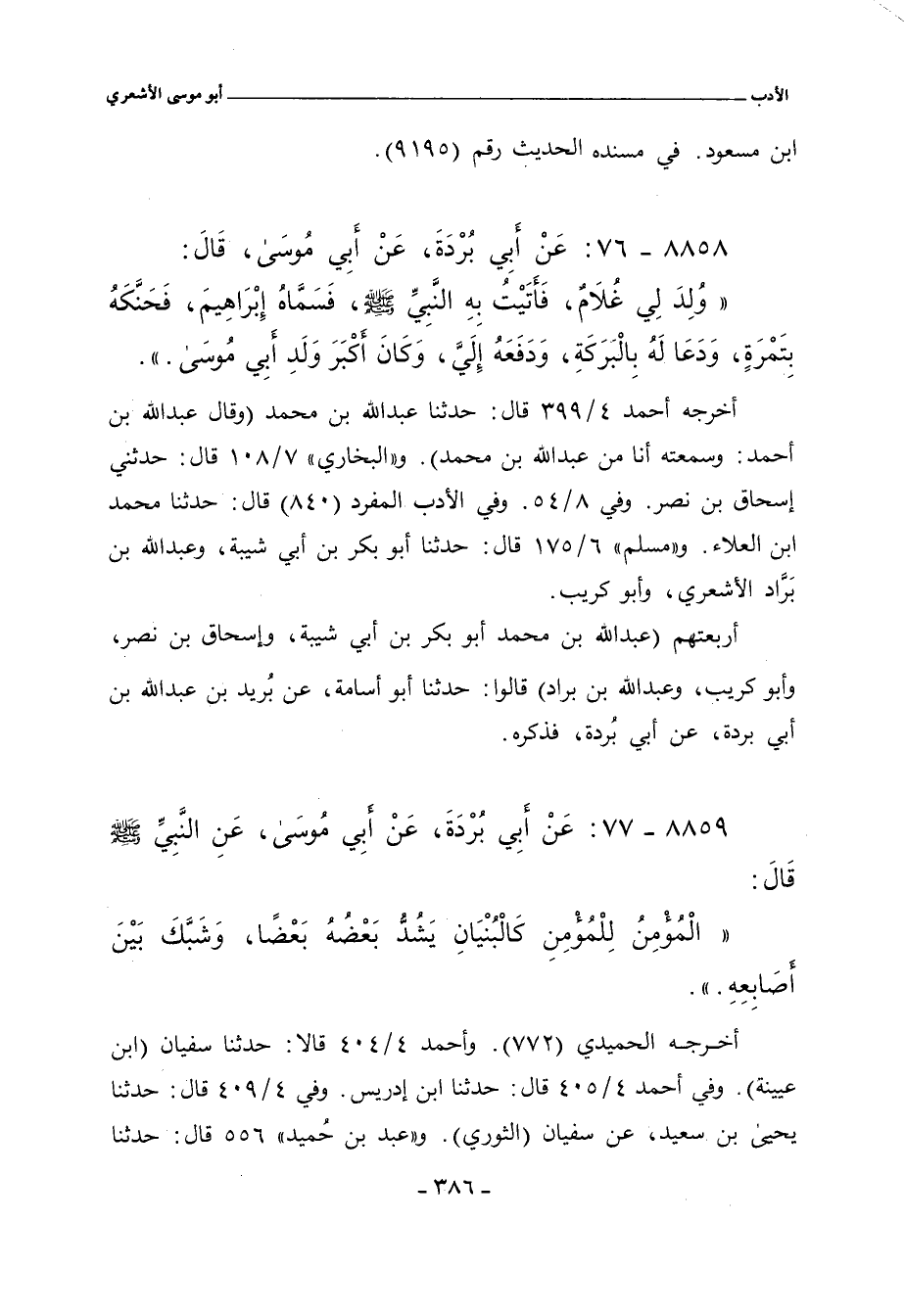 أخرجه أحمد ٤/ ٣٩٩ قال: حدَّثنا عبد الله بن محمد (وقال عبد الله بن أحمد: وسمعته أنا من عبد الله بن محمد). والبخاري ٧/ ١٠٨ قال: حدثني إسحاق بن نصر. وفي ٨/ ٥٤. وفي الأدب المفرد (٨٤٠) قال: حدَّثنا محمد بن العلاء. ومسلم ٦/ ١٧٥ قال: حدَّثنا أبو بكر بن أبي شيبة، وعبد الله بن بَرَّاد الأشعري، وأبو كريب.