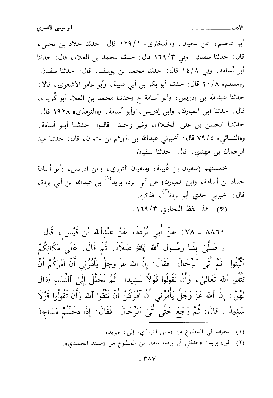 أبو عاصم، عن سفيان. وإلبخاري ١/ ١٢٩ قال: حدَّثنا خلاد بن يحيى، قال: حدَّثنا سفيان. وفي ٣/ ١٦٩ قال: حدَّثنا محمد بن العلاء، قال: حدَّثنا أبو أُسامة. وفي ٨/ ١٤ قال: حدَّثنا محمد بن يوسف، قال: حدَّثنا سفيان. ومسلم ٨/ ٢، قال: حدَّثنا أبو بكر بن أبي شيبة، وأبو عامر الأشعري، قالا: حدَّثنا عبد الله بن إدريس، وأبو أُسامة ح وحدَّثنا محمد بن العلاء أبو كُريب، قال: حدَّثنا ابن المبارك، وابن إدريس، وأبو أُسامة. والترمذي ١٩٢٨ قال: حدَّثنا الحسن بن علي الخلال، وغير واحد. قالوا: حدَّثنا أبو أُسامة. والنسائي ٥/ ٧٩ قال: أخبرني عبد الله بن الهيثم بن عثمان، قال: حدَّثنا عبد الرحمن بن مهدي، قال: حدَّثنا سفيان.