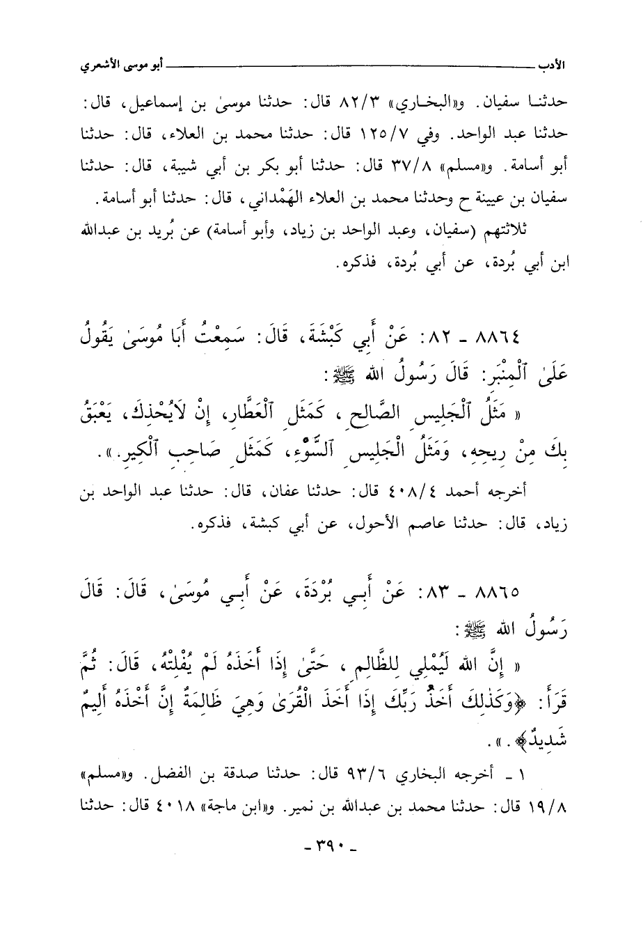 ثلاثتهم (سفيان، وعبد الواحد بن زياد، وأبو أُسامة) عن بُريد بن عبد الله بن أبي بُردة، عن أبي بُردة، فذكره.