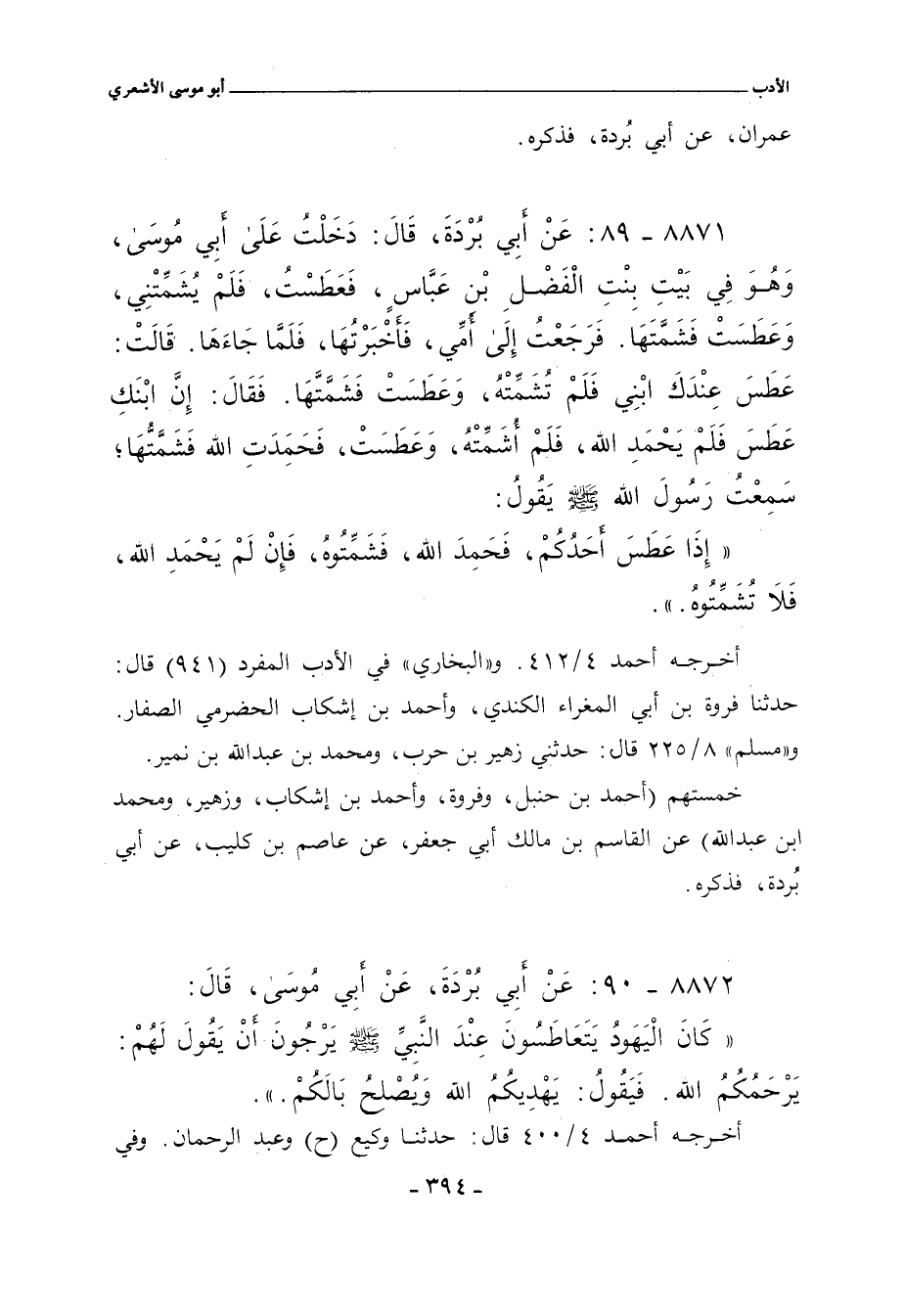 ٨٨٧١ - عَنْ أَبِي بُرْدَةَ، قال: دَخَلْتُ عَلَى أَبِي مُوسَى، وَهُوَ فِي بَيْتِ بِنْتِ الْفَضْلِ بْن عَبَّاسٍ، فَعَطَسْتُ، فَلَمْ يُشَمِّتْنِي، وَعَطَسَتْ فَشَمَّتَهَا. فَرَجَعْتُ إِلَى أمِّي، فَأَخْبَرْتُهَا، فَلَمَّا جَاءَهَا. قالتْ: عَطَسَ عِنْدَكَ ابْنِي فَلَمْ تُشَمِّتْهُ، وَعَطَسَتْ فَشَمَّتَّهَا. فَقال: إِنَّ ابْنَكِ عَطَسَ فَلَمْ يَحْمَدِ الله، فَلَمْ أشَمِّتْهُ، وَعَطسَتْ، فَحَمَدَتِ الله فَشَمَّتُّهَا؟ سَمِعْتُ رَسُولَ الله صلى الله عليه وسلم يَقُولُ: