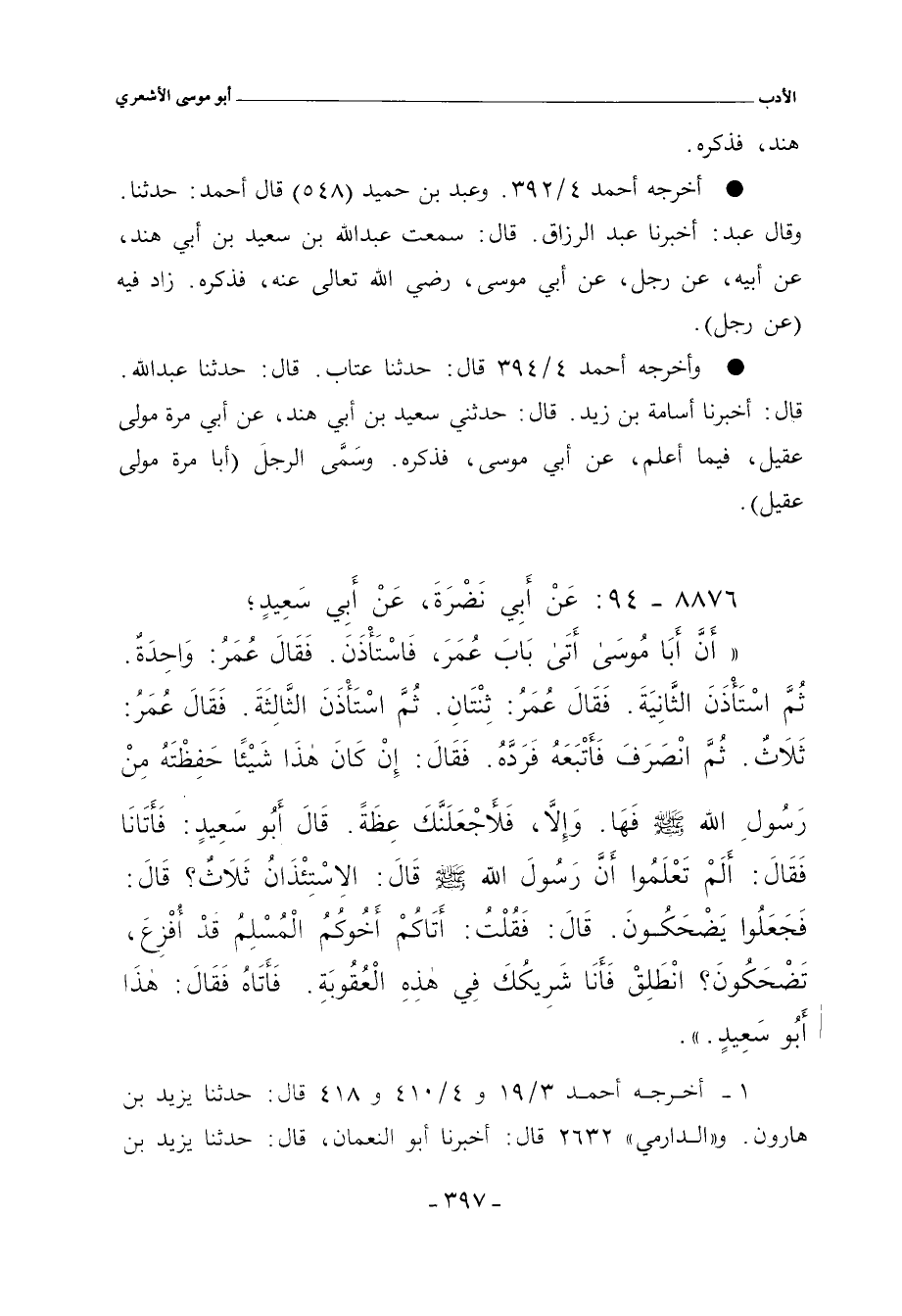 أَنَّ أَبَا مُوسَى أَتَى بَابَ عُمَرَ، فَاسْتَأْذَنَ. فَقال عُمَرُ: وَاحِدَةٌ. ثُمَّ اسْتَأْذَنَ الثَّانِيَةَ. فَقال عُمَرُ: ثِنْتَانِ. ثُمَّ استَأْذَنَ الثَّالِثَةَ. فَقال عُمَر: ثَلَاثٌ. ثُمَّ انْصَرَفَ فَأَتْبَعَهُ فَرَدَّهُ. فَقال: إِنْ كَانَ هَذَا شَيْئًا حَفِظْتَهُ مِنْ رَسُولِ الله صلى الله عليه وسلم فَهَا. وَإلَاّ، فلأجْعَلَنَّكَ عِظَةً. قال أبُو سَعِيدٍ: فَأَتَانَا فَقال: أَلَمْ تَعْلَمُوا أَنَّ رَسُولَ الله صلى الله عليه وسلمقال: الاسْتِئْذَانُ ثَلَاثٌ؟ قال: فَجَعَلُوا يَضْحَكُونَ. قال: فَقُلْتُ: أَتَاكُمْ أَخُوكُمُ الْمُسْلِمُ قدْ أُفْزِعَ، تَضْحَكُونَ؟ انْطَلِقْ فَأَنَا شَرِيكُكَ فِي هَذِهِ الْعُقُوبَةِ. فَأَتَاهُ فَقال: هَذَا أَبُو سَعِيدٍ.