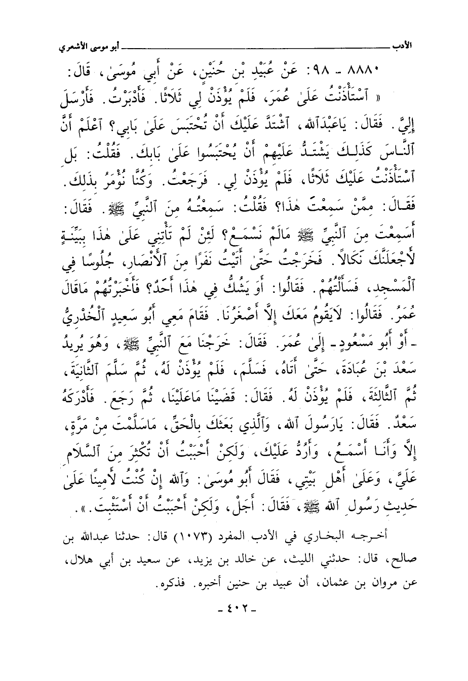 اسْتَأْذَنْتُ عَلَى عُمَرَ، فَلَمْ يُؤْدَنْ لِي ثَلَاثًا. فَأدْبَرْتُ. فَأرْسَلَ إِلِيَّ. فَقال: يَاعبد الله، اشْتَدَّ عَلَيْكَ أَنْ تُحْتَبَسَ عَلَى بَابِي؟ اعْلَمْ أنَّ النَّاسُ كَذَلِكَ يَشْتَدُّ عَلَيْهِمْ أَنْ يُحْتَبَسُوا عَلَى بَابِكَ. فَقُلْتُ: بَل اسْتَأذًنْتُ عَلَيْكَ ثَلَاثًا، فَلَمْ يُؤْذَنْ لِي. فَرَجَعْتُ. وَكُنَّا نُؤْمَرُ بِذَلِكَ. فَقال: مِمَّنْ سَمِعْتَ هَذَا؟ فَقُلْتُ: سَمِعْتُهُ مِنَ النَّبِيِّ صلى الله عليه وسلم. فَقال: أسَمِعْتَ مِنَ اْلنَّبِيِّ صلى الله عليه وسلم مَالَمْ نَسْمَعْ؟ لَئِنْ لَمْ تَأتِنِي عَلَى هَذَا بِبَيِّنَةٍ لأجْعَلَنَّكَ نَكَالَا َ. فَخَرَجْتُ حَتَّى أَتَيْتُ نَفَرًا مِنَ الَانْصَارِ، جُلُوسًا فِي الْمَسْجِدِ، فَسَاللهمْ. فَقالوا: أَوَ يَشُكُّ فِي هَذَا أَحَدٌ؟ فَأَخْبَرْتُهُمْ مَا قال عُمَرُ. فَقالوا: لَايَقُومُ مَعَكَ إلَاّ أَصْغَرُنَا. فَقَامَ مَعِي أَبُو سَعِيدٍ ألْخُدْرِيُّ -أوْ أبُو مَسْعُودٍ - إِلَى عُمَرَ. فَقال: خَرَجْنَا مَعَ النَّبِيِّ صلى الله عليه وسلم، وَهُوَ يُرِيدُ سَعْدَ بْنَ عُبَادَةَ، حَتَّى أَتَاهُ، فَسَلَّمَ، فَلَمْ يُؤْذَنْ لَهُ، ثُمَّ سَلَّمَ الثَّانِيَةَ، ثُمَّ الثَّالِثَةَ، فَلَمْ يُؤْذَنْ لَهُ. فَقال: قَضَيْنَا مَاعَلَيْنَا، ثُمَّ رَجَعَ. فَأَدْرَكَهُ سَعْدٌ. فَقال: يَارَسُولَ الله، وَالَّذِي بَعَثَكَ بِالْحَقِّ، مَاسَلَّمْتَ مِنْ مَرَّةٍ، ألا وَأنَا أَسْمَعُ، وَأَرُدُّ عَلَيْكَ، وَلَكِنْ أَحْبَبْتُ أنْ تُكْثِرَ مِنَ السَّلَامِ عَلَيَّ، وَعَلَى أَهْلِ بَيْتِي، فَقال أبو موسى: وَاللهّ إِنْ كُنْتُ لأمِينًا عَلىَ حَدِيثِ رَسُولِ الله صلى الله عليه وسلم، فَقال: أَجَلْ، وَلَكِنْ أَحْبَبْتُ أَنْ أسْتَثْبِتَ.