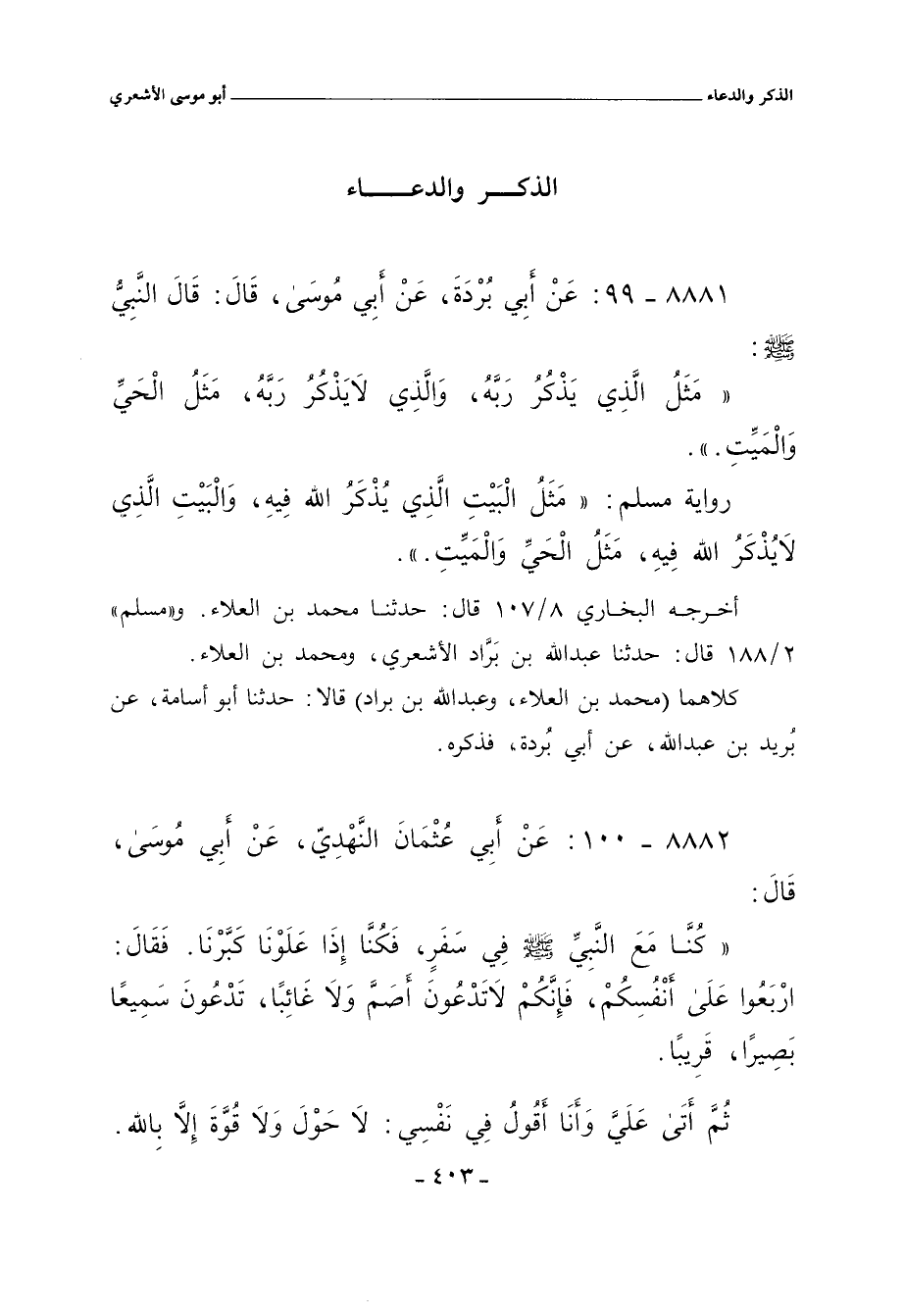 كُنَّا مَعَ النَّبِيِّ صلى الله عليه وسلم فِي سَفَرٍ، فَكُنَّا إِذَا عَلَوْنَا كَبَّرْنَا. فَقال: ارْبَعُوا عَلَى أَنْفُسِكُمْ، فَإِنَّكُمْ لَا تَدْعُونَ أَصَمَّ وَلَا غَائِبًا، تَدْعُونَ سَمِيعًا بَصِيرًا، قَرِيبًا.