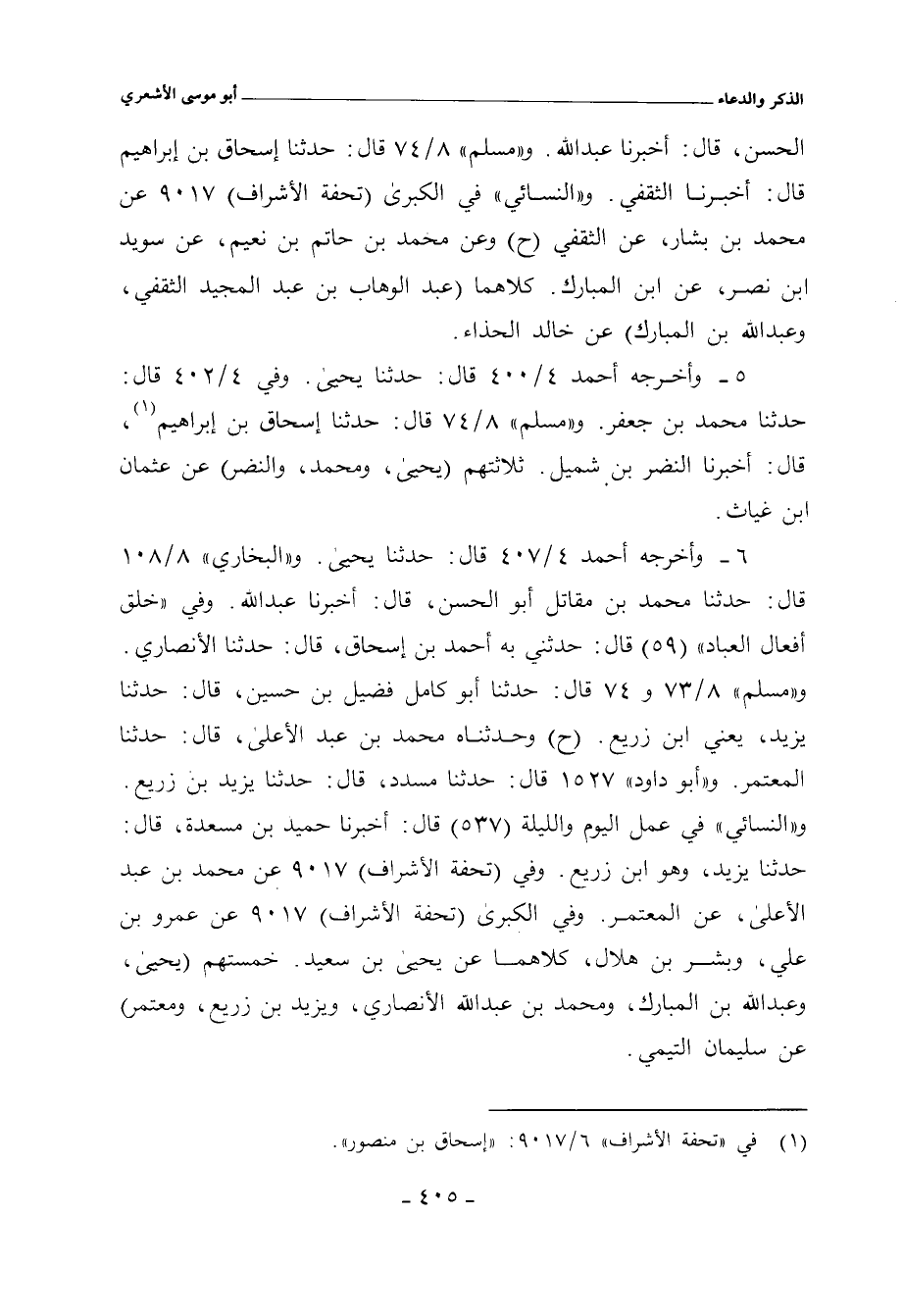 ٦ - وأخرجه أحمد ٤/ ٤٠٧ قال: حدَّثنا يحيى. والبخاري ٨/ ١٠٨ قال: حدَّثنا محمد بن مقاتل أبو الحسن، قال: أَخْبَرنا عبد الله. وفي خلق أفعال أفعال (٥٩) قال: حدثني به أحمد بن إسحاق، قال: حدَّثنا الأنصاري. ومسلم ٨/ ٧٣ و ٧٤ قال: حدَّثنا أبو كامل فضيل بن حسين، قال: حدَّثنا يزيد، يعني ابن زريع (ح) وحدَّثناه محمد بن عبد الأعلى، قال: حدَّثنا المعتمر. وأبو داود ١٥٢٧ قال: حدَّثنا مسدد، قال: حدَّثنا يزيد بن زريع. والنسائي في عمل اليوم والليلة (٥٣٧) قال: أَخْبَرنا حميد بن مسعدة، قال: حدَّثنا يزيد، وهو ابن زريع. وفي (تحفة الأشراف) ٩٠١٧ عن محمد بن عبد الأعلى، عن المعتمر. وفي "الكبرى" (تحفة الأشرأف) ٩٠١٧ عن عمرو بن علي، وبشر بن هلال، كلاهما عن يحيى بن سعيد.