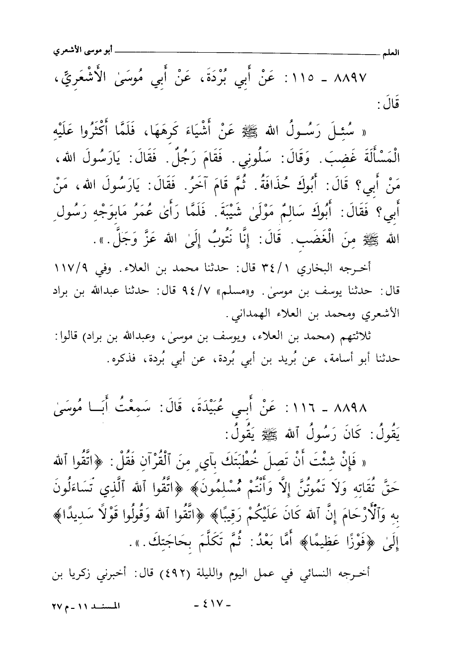 ثلاثتهم (محمد بن العلاء، ويوسف بن موسى، وعبد الله بن براد) قالوا: حدَّثنا أبو أُسامة، عن بُريد بن أبي بُردة، عن أبي بُردة، فذكره.