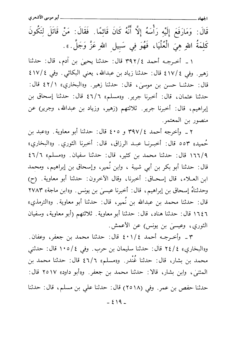 ا - أخرجه أحمد ٤/ ٣٩٢ قال: حدَّثنا يحيى بن آدم، قال: حدَّثنا زهير. وفي ٤/ ٤١٧ قال: حدَّثنا زياد بن عبد الله، يعني البكائي. وفي ٤/ ٤١٧ قال: حدَّثنا حسن بن موسى، قال: حدَّثنا زهير. والبخاري ١/ ٤٢ قال: حدَّثنا عثمان، قال: أَخْبَرنا جرير. ومسلم ٦/ ٤٦ قال: حدَّثنا إسحاق بن إبراهيم، قال: أَخْبَرنا جرير. ثلاثتهم (زهير، وزياد بن عبد الله، وجرير) عن منصور بن المعتمر.