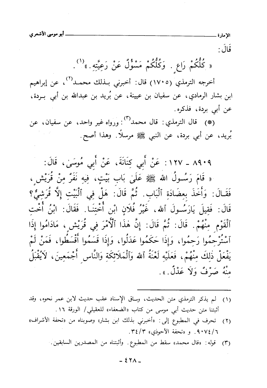 - قال الترمذي: قال محمد: ورواه غير واحد، عن سفيان، عن بُريد، عن أبي بردة، عن النبي صلى الله عليه وسلم مرسلاً. وهذا أصح.