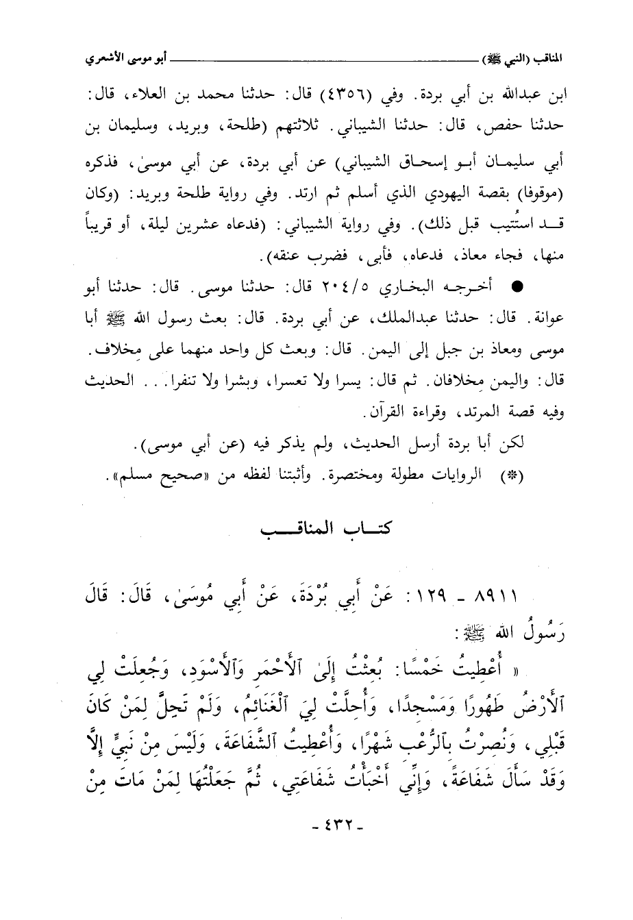 بن عبد الله بن أبي بردة. وفي (٤٣٥٦) قال: حدَّثنا محمد بن العلاء، قال: حدَّثنا حفص، قال: حدَّثنا الشيباني. ثلاثتهم (طلحة، وبريد، وسليمان بن أبي سليمان أبو إسحاق الشيباني) عن أبي بردة، عن أبي موسى، فذكره (موقوفا) بقصة اليهودي الذي أسلم ثم ارتد. وفي رواية طلحة وبريد: "وكان قد استُتيب قبل ذلك). وفي رواية الشيباني: "فدعاه عشرين ليلة، أو قريبًا منها، فجاء معاذ، فدعاه، فأبى، فضرب عنقه".