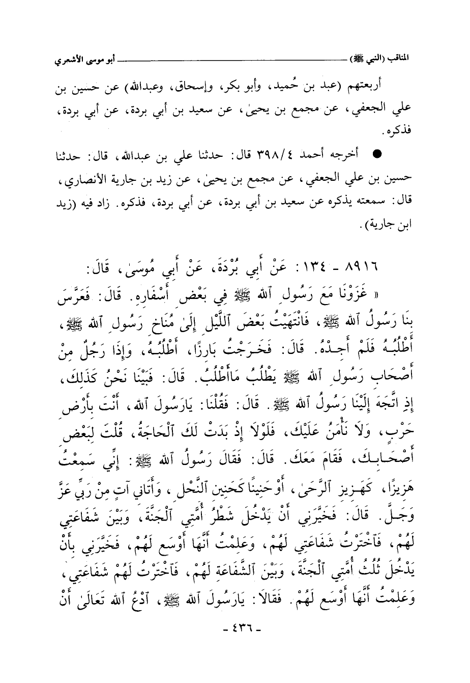 أربعتهم (عبد بن حُميد، وأبو بكر، وإسحاق، وعبد الله) عن حسين بن علي الجعفي، عن مجمع بن يحيى، عن سعيد بن أبي بردة، عن أبي بردة، فذكره.