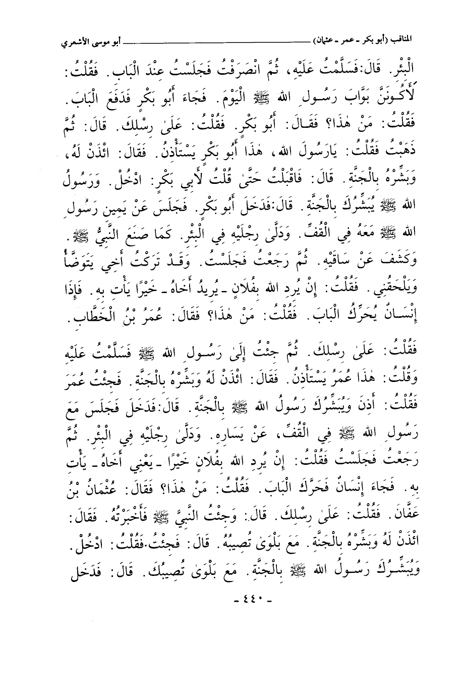 الْبِئْرِ. قال: فَسَلَّمْتُ عَلَيْهِ، ثُمَّ انْصَرَفْتُ فَجَلَسْتُ عِنْدَ الْبَابِ. فَقُلْتُ: لأَكًونَنَّ بَوَّابَ رَسًولِ الله صلى الله عليه وسلم الْيَوْمَ. فَجَاءَ أبُو بَكْرٍ فَدَفَعَ الْبَابَ. فَقُلْتُ: مَنْ هَذَا؟ فَقال: أبُو بَكْرٍ. فَقُلْتُ: عَلَى رِسْلِكَ. قال: ثًمَّ ذَهَبْتُ فَقُلْتُ: يَارَسُولَ الله، هَذَا أَبُو بَكْرٍ يَسْتَأْذِنُ. فَقال: ائْذَنْ لَهُ، وَبَشِّرْهُ بِالْجَنَّةِ. قال: فَاقْبَلْتُ حَتَّى قُلْتُ لأَبِي بَكْرٍ: ادْخُلْ. وَرَسُولُ الله صلى الله عليه وسلم يُبَشِّرُكَ بِالْجَنَّةِ. قال: فَدَخَلَ أَبُو بَكْرٍ. فَجَلَسَ عَنْ يَمِين رَسُولِ الله صلى الله عليه وسلم مَعَهُ فِي الْقُفِّ. وَدَلَّى رِجْلَيْهِ فِي الْبِئْرِ. كَمَا صَنَعَ النَّبِيُّ صلى الله عليه وسلم. وَكَشَفَ عَنْ سَاقَيْهِ. ثُمَّ رجعت فَجَلَسْتُ. وَقَدْ تَرَكْتُ أَخِي يَتَوَضَّا وًيلْحَقُنِي. فَقُلْتُ: إِنْ يُرِدِ الله بِفُلَانٍ-يُرِيدُ أَخَاهُ - خَيْرًا يَأْتِ بِهِ. فَإِذَا إِنْسَانٌيُحَرِّكُ الْبَابَ. فَقُلْتُ: مَنْ
