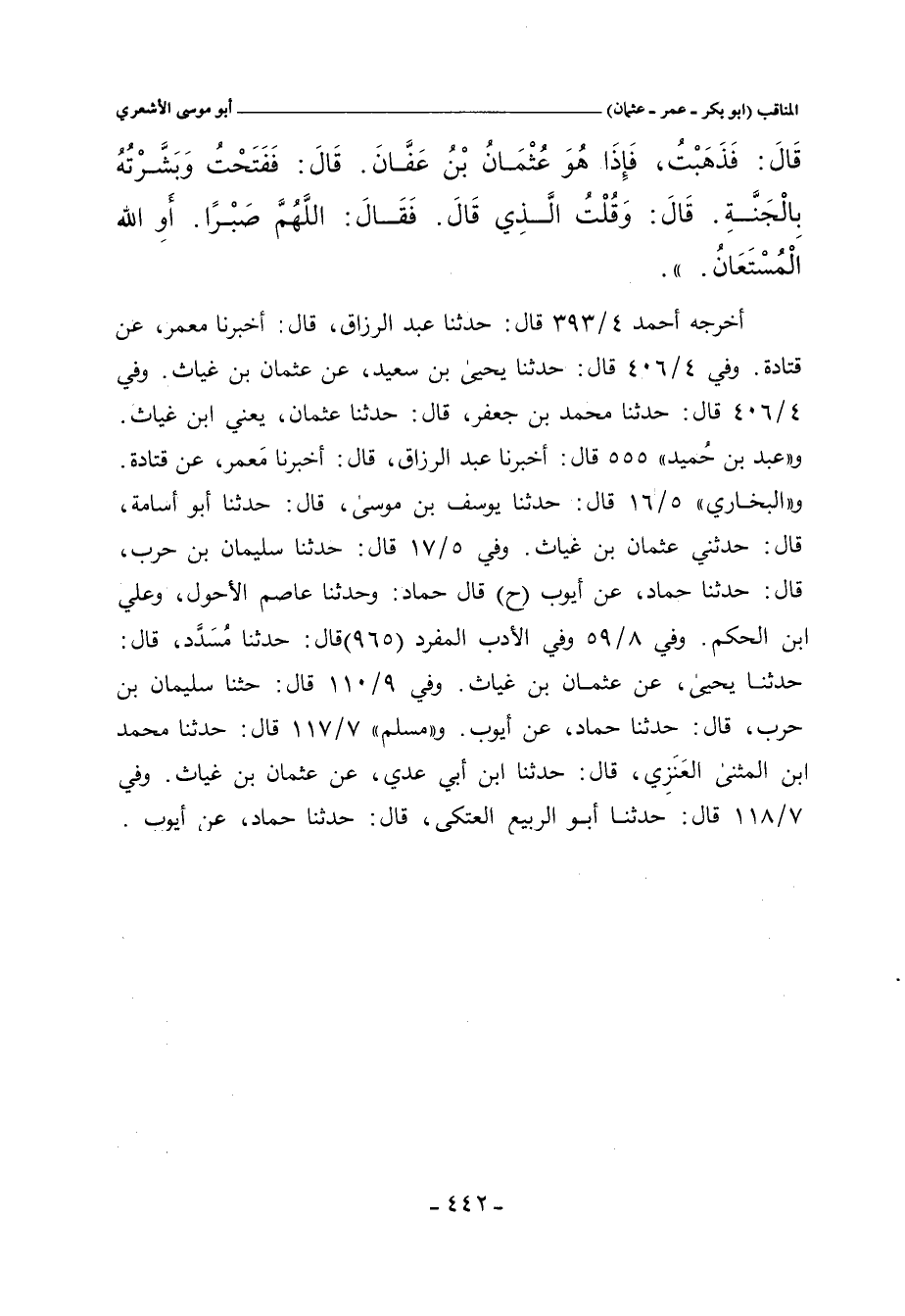قال: فَذَهَبْتُ، فَإِذَا هُوَ عُثْمَانُ بْنُ عَفَّانَ. قال: فَفَتَحْتُ وَبَشَّرْتُهُ بِالْجَنَّةِ. قال: وَقُلْتُ الَّذِي قال. فَقال: اللهمَّ صبْرًا. أوِ الله الْمُسْتَعَانُ.