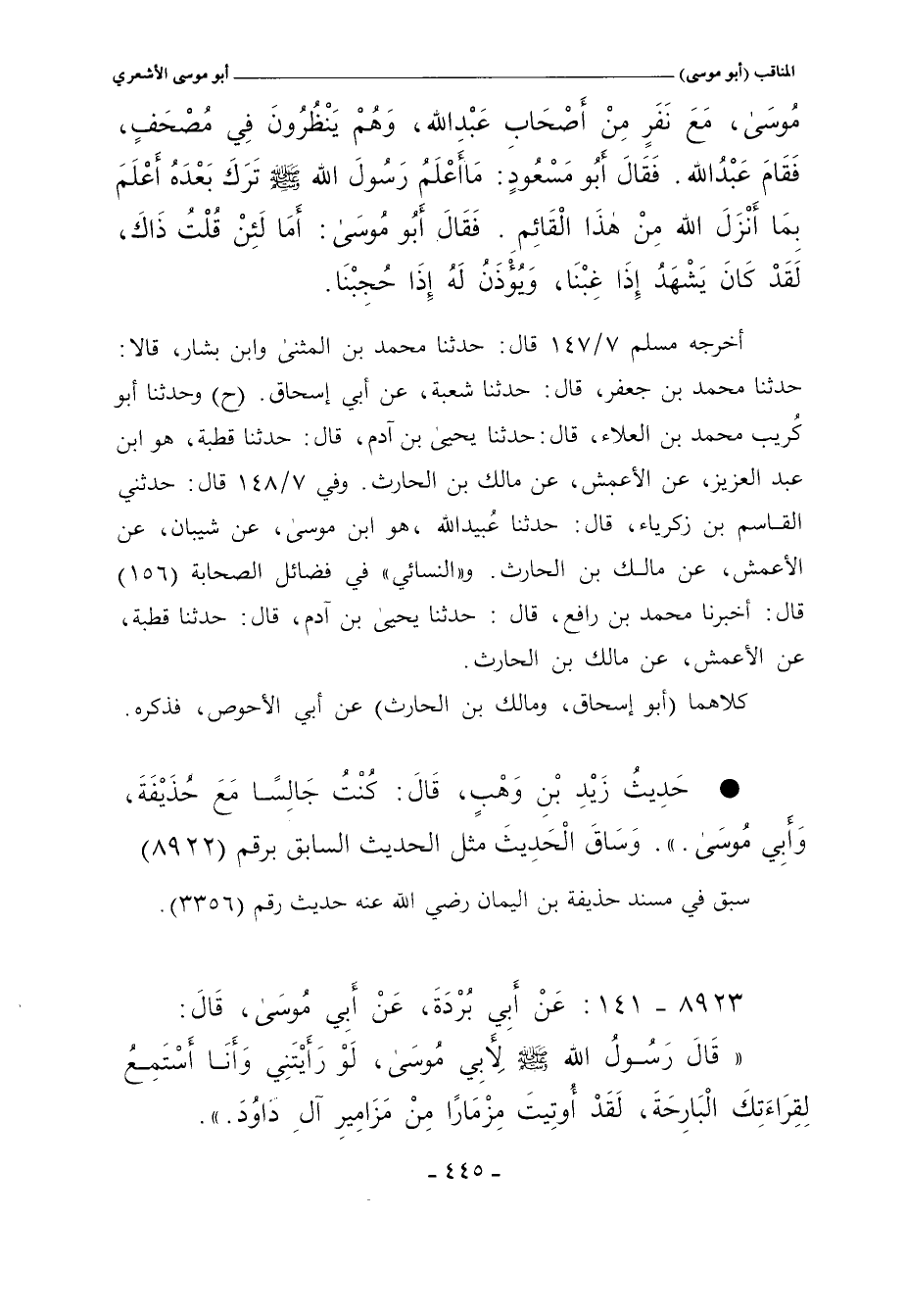 مُوسَى، مَعَ نَفَرٍ مِنْ أَصْحَابِ عبد الله، وَهُمْ يَنْظُرُونَ فِي مُصْحَفٍ، فَقَامَ عبد الله. فَقال أبُو مَسْعُودٍ: مَا أَعْلَمُ رَسُولَ الله صلى الله عليه وسلم تَرَكَ بَعْدَهُ أَعْلَمَ بِمَا أَنْزَلَ الله مِنْ هَذَا الْقَائِمِ. فَقال أبُو مُوسَى: أمَا لَئِنْ قُلْتُ ذَاكَ، لَقَدْ كَانَ يَشْهَدُ إِذَا غِبْنَا، وَيُؤْذَنُ لَهُ إِذَا حُجِبْنَا.