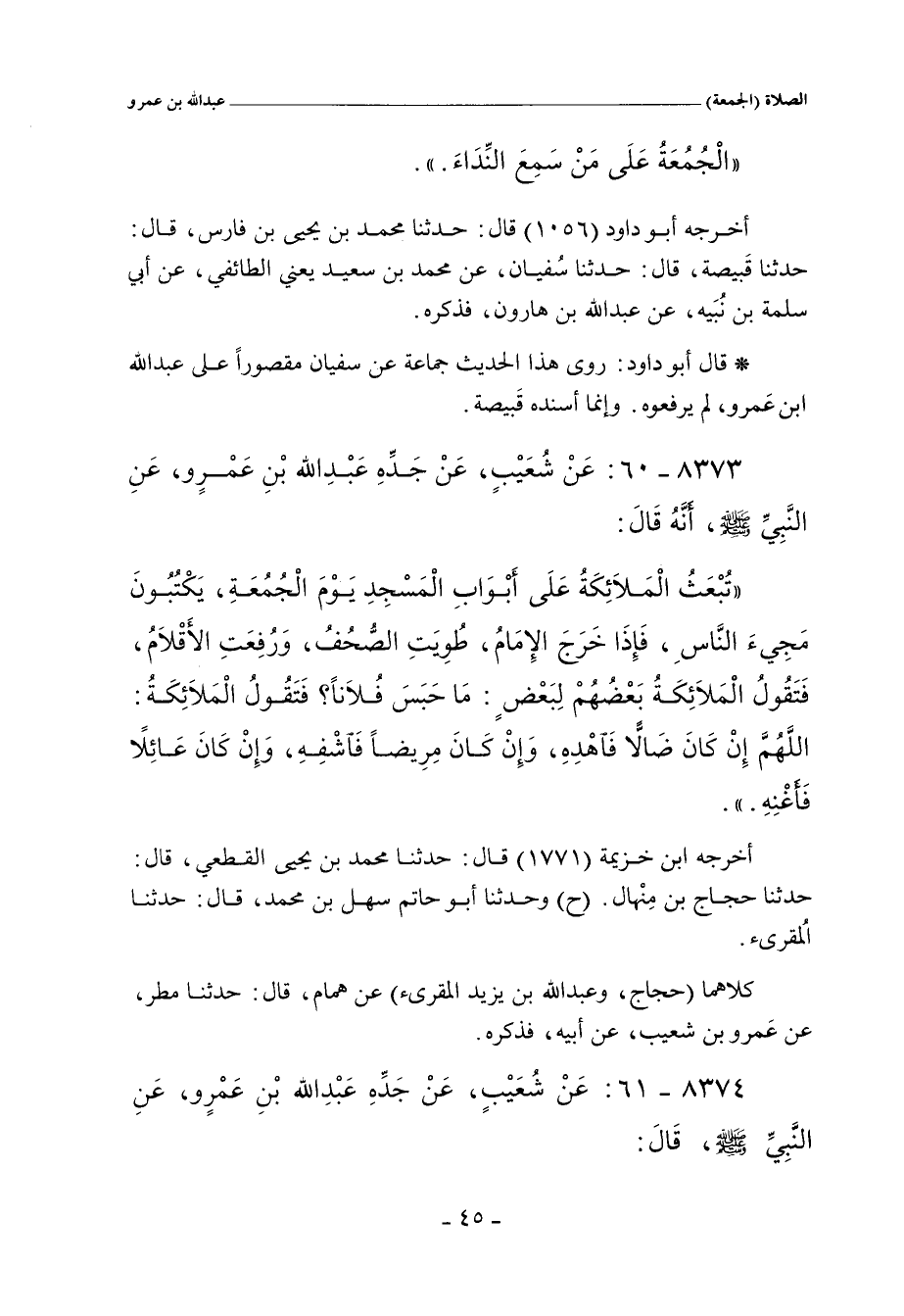 - قال أبو داود: روى هذا الحديث جماعةٌ، عن سفيان، مقصورًا على عبدِ الله بن عَمرو، لم يرفعوه، وإنما أسنده قَبيصةُ.