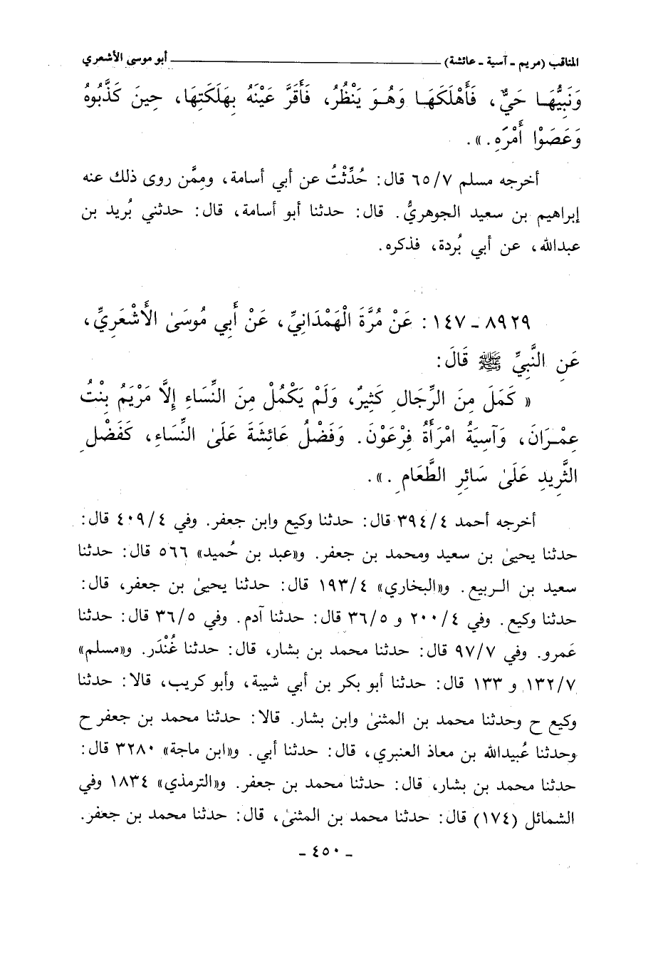 كَمَلَ مِنَ الرِّجَالِ كَثِيرٌ، وَلَمْ يَكْمُلْ مِنَ النِّسَاءِ إلا مَرْيَمُ بِنْتُ عِمْرَانَ، وَآسِيَةُ امْرَأَةُ فِرْعَوْنَ. وَفَضْلُ عَائِشَةَ عَلَى النِّسَاءِ، كَفَضْلِ الثَّرِيدِ عَلَى سَائِرِ الطَّعَامِ.