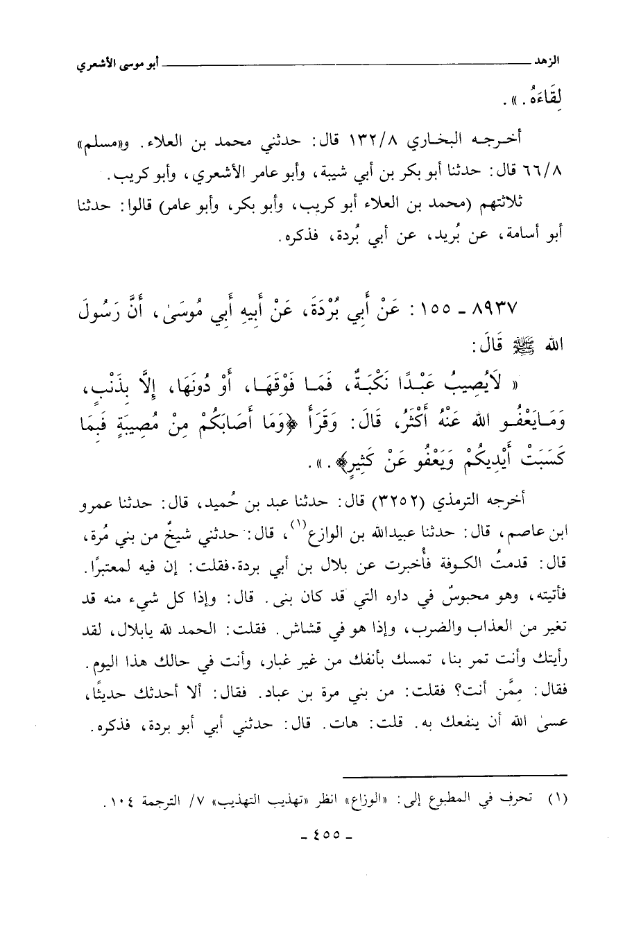 أخرجه الترمذي (٣٢٥٢) قال: حدَّثنا عبد بن حُميد، قال: حدَّثنا عمرو بن عاصم، قال: حدَّثنا عُبيد الله بن الوازع. قال: حدثني شيخٌمن بني مُرة، قال: قدمتُ الكوفة فأخبرت عن بلال بن أبي بردة. فقلت: إن فيه لمعتبرًا. فأتيته، وهو محبوسٌفي داره التي قد كان بنى. قال: وإذا كل شيء منه قد تغير من العذاب والضرب، وإذا هو في قشاش. فقلت: الحمد لله يابلال، لقد رأيتك وأنت تمر بنا، تمسك بأنفك من غير غبار، وأنت في حالك هذا اليوم. فقال: مِمًن أنت؟ فقلت: من بني مرة بن عباد. فقال: ألا أحدثك حديثًا، عسى الله أن ينفعك به. قلت: هات. قال: حدثني أبي أبو بردة، فذكره.
