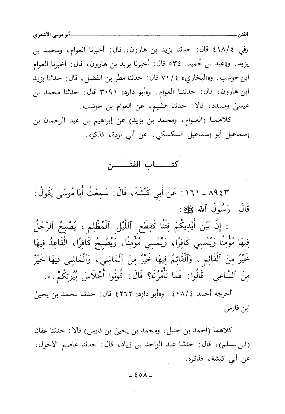 وفي ٤/ ٤١٨ قال: حدَّثنا يزيد بن هارون، قال: أَخْبَرنا العوام، ومحمد بن يزيد. وعبد بن حُميد ٥٣٤ قال: أَخْبَرنا يزيد بن هارون، قال: أَخْبَرنا العوام بن حوشب. والبخاري ٤/ ٧، قال: حدَّثنا مطر بن الفضل، قال: حدَّثنا يزيد بن هارون، قال: حدَّثنا العوام. وأبو داود ٣٠٩١ قال: حدَّثنا محمد بن عيسى ومسدد، قالا: حدَّثنا هشيم، عن العوام بن حوشب.