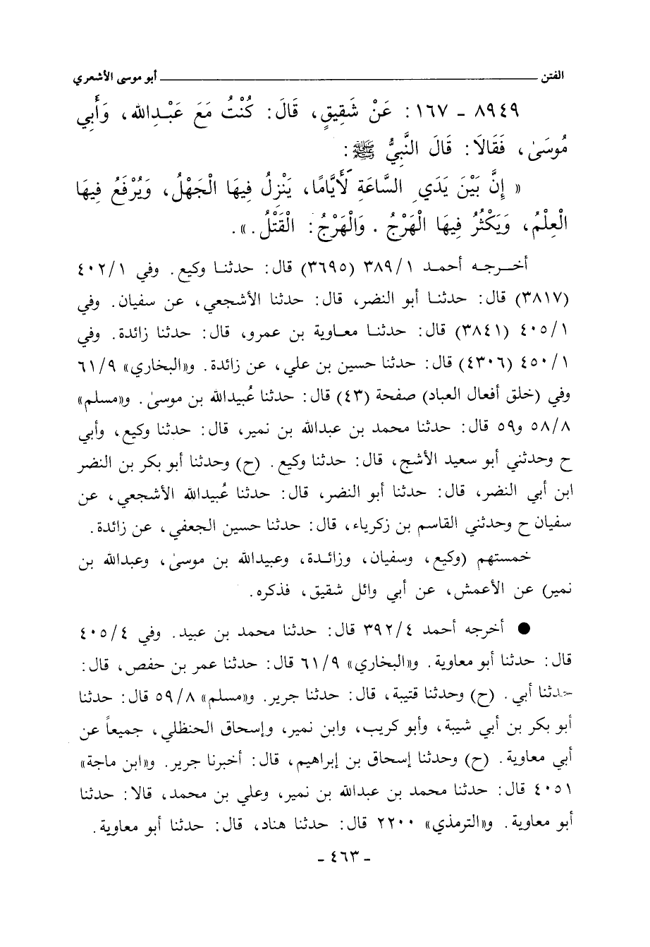 - أخرجه أحمد ٤/ ٣٩٢ قال: حدَّثنا محمد بن عبيد. وفى ٤/ ٤٠٥ قال: حدَّثنا أبو معاوية. والبخاري ٩/ ٦١ قال: حدَّثنا عمر بن حفص، قال: حدَّثنا أبي (ح) وحدَّثنا قُتَيبة، قال: حدَّثنا جرير. ومسلم ٨/ ٥٩ قال: حدَّثنا أبو بكر بن أبي شيبة، وأبو كريب، وابن نمير، وإسحاق الحنظلي، جميعًا عن أبي معاوية (ح) وحدَّثنا إسحاق بن إبراهيم، قال: أَخْبَرنا جرير. وو"ابن ماجة" ٤٠٥١ قال: حدَّثنا محمد بن عبد الله بن نمير، وعلى بن محمد، قالا: حدَّثنا أبو معاوية. والترمذي ٢٢٠، قال: حدَّثنا هناد، قال: حدَّثنا أبو معاوية.