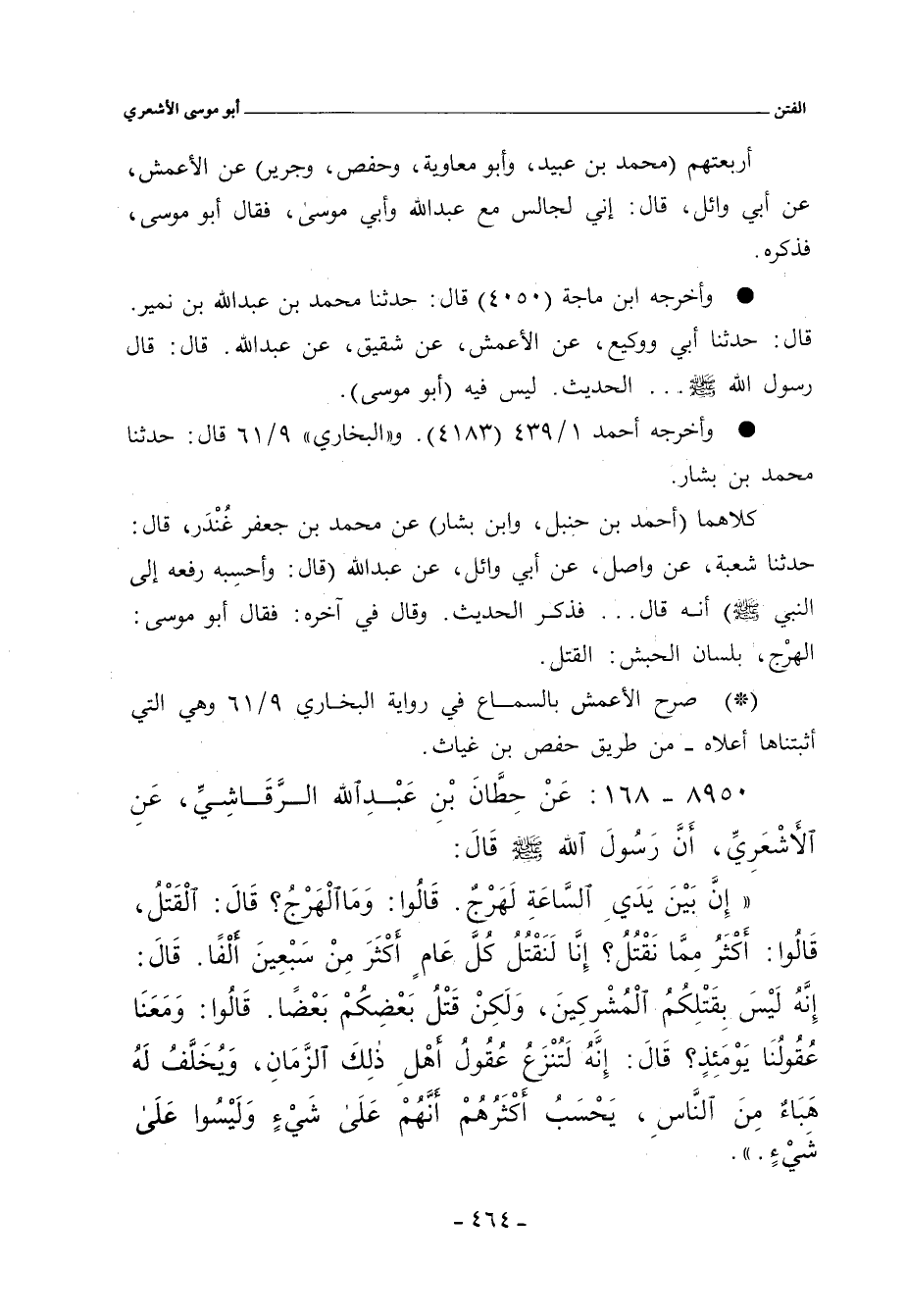 كلاهما (أحمد بن حنبل، وابن بشار) عن محمد بن جعفر غُنْدَر، قال: حدَّثنا شعبة، عن واصل، عن أبي وائل، عن عبد الله (قال: وأحسِبه رفعه إلى النبي صلى الله عليه وسلم) أنه قال .. فذكر الحديث. وقال في آخره: فقال أبو موسى: الهرْج، بلسان الحبش: القتل.