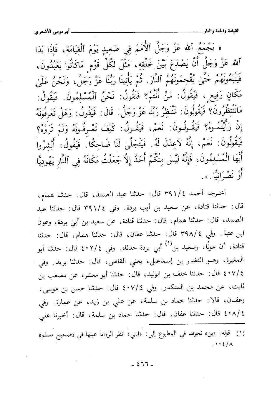 يَجْمَعُ الله عَزَّ وَجَلَّ الأمَمَ فِي صَعِيدٍ يَوْمَ الْقِيَامَةِ، فَإِذَا بَدَا الله عَزَّ وَجَلَّ أَنْ يَصْدَعَ بَيْنَ خَلْقِهِ، مَثَّلَ لِكُلِّ قَوْمٍ مَاكَانُوا يَعْبُدُونَ، فَيَتْبَعُونَهُمْ حَتَّى يُقْحِمَونَهُمُ النَّارَ. ثُمَّ يَأْتِينَا رَبُّنَا عَزَّ وَجَلَّ، وَنَحْنُ عَلَى مَكَانٍرَفِيعٍ، فَيَقُولُ: مَنْ أنْتُمْ؟ فَنَقولُ: نَحْنُ الْمُسلِمُونَ. فَيَقُولُ: مَاتَنْتِظُرُونَ؟ فَيَقُولُونَ: نَنْتَظِرُ رَبَّنَا عَزَّ وَجَلَّ. قال: فَيَقُولُ: وَهَلْ تَعْرِفُونَهُ إِنْ رَأيْتُمُوهُ؟ فَيَقُولُونَ: نَعَمْ، فَيَقُولُ: كَيْفَ تَعْرِفُونَهُ وَلَمْ تَرَوْهُ؟ فَيَقُولُونَ: نَعَمْ، إِنَّهُ لَا عِدْلَ لَهُ. فَيَتَجَلَّى لَنَا ضَاحِكًا. فَيَقُولُ: أبْشِرُوا أيُّهَا الْمُسْلِمُونَ، فَإِنَّهُ لَيْسَ مِنْكُمْ أَحَدٌ إلا جَعَلْتُ مَكَانَهُ فِي النَّارِ يَهُودِيًّا أوْ نَصْرَانِيًّا.