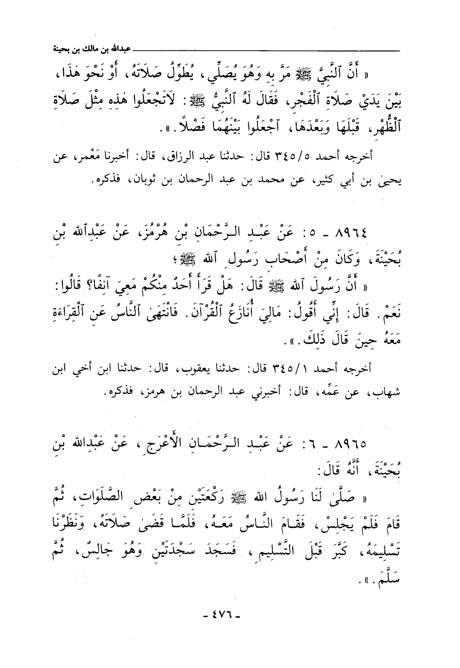 ٨٩٦٤ - عَنْ عَبْدِ الرَّحْمَانِ بْنِ هُرْمُزَ، عَنْ عَبْدِ اللهِ بْنِ بُحَيْنَةَ، وَكَانَ مِنْ أَصْحَابِ رَسُولِ اللهِ صلى الله عليه وسلم؛