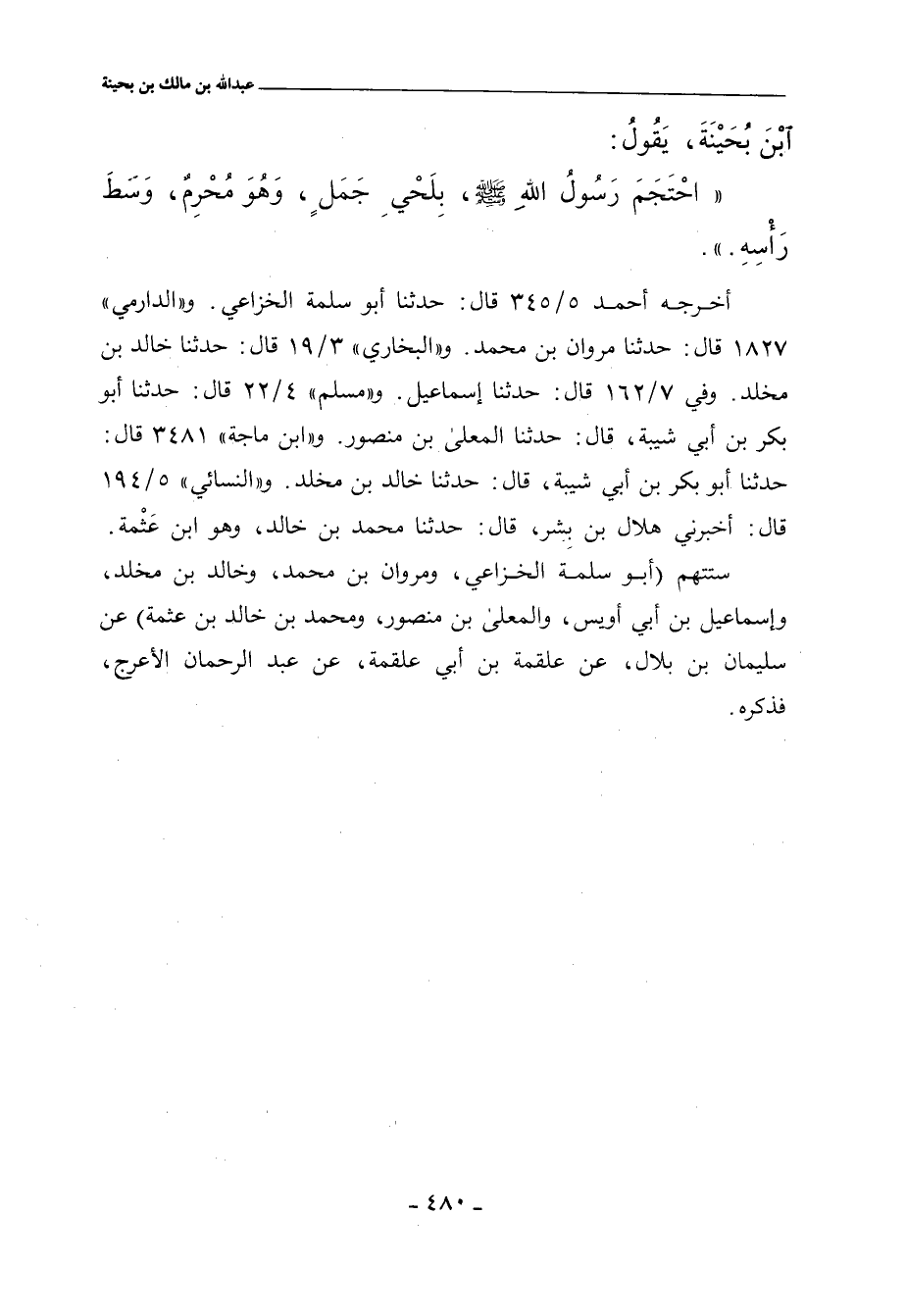 احْتَجَمَ رَسُولُ اللهِ صلى الله عليه وسلم، بِلَحْيِ جَمَلٍ، مِنْ طَرِيقِ مَكَّةَ، عَلَى وَسَطِ رَأْسِهِ، وَهُوَ مُحْرِمٌ.