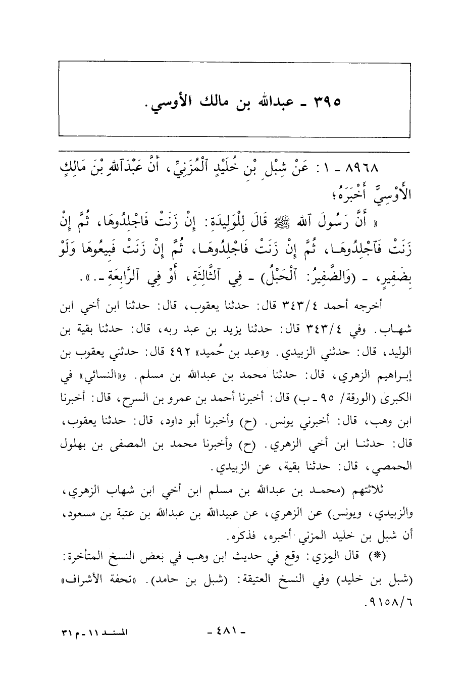 أخرجه أحمد ٤/ ٣٤٣ (١٩٢٢٦) قال: حدَّثنا يعقوب، حدَّثنا ابن أخي ابن شهاب. وفي ٤/ ٣٤٣ (١٩٢٢٧) قال: حدَّثنا يزيد بن عبد ربه، حدَّثنا بقية بن الوليد، حدثني الزبيدي. و"عَبد بن حُميد" ٤٩٢ قال: حدثني يعقوب بن إبراهيم الزهري، حدَّثنا محمد بن عبد الله بن مسلم. و"النَّسائي" في "الكبرى" ٧٢٢ قال: أَخْبَرنا أحمد بن عمرو بن السرح، قال: أَخْبَرنا ابن وهب، قال: أخبرني يونس. وفي (٧٢٢٣) قال: أَخْبَرنا أبو داود، قال: حدَّثنا يعقوب، قال: حدَّثنا ابن أخي الزهري. وفي (٧٢٢٣) قال: أَخْبَرنا محمد بن المصفى بن بهلول الحمصي، قال: حدَّثنا بقية، عن الزبيدي.