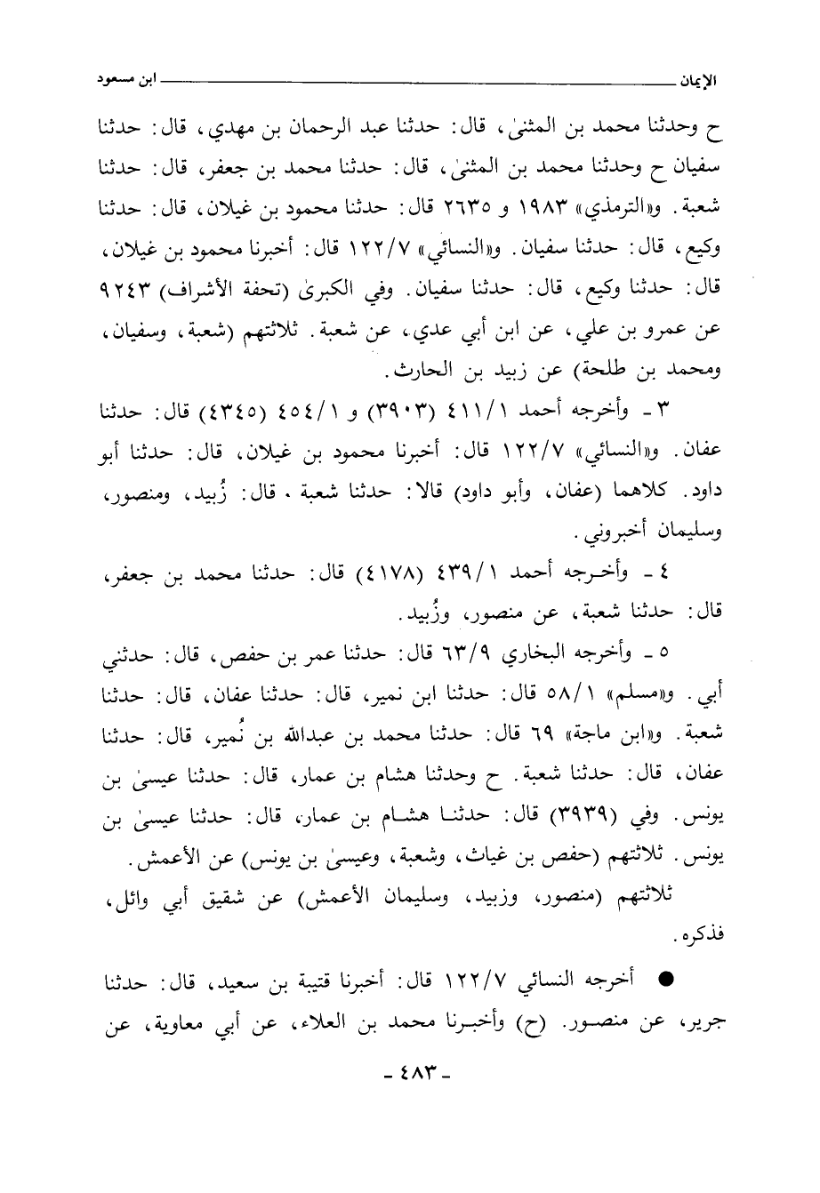 (ح) وحدَّثنا محمد بن المثنى، حدَّثنا عبد الرحمن بن مهدي، حدَّثنا سفيان (ح) وحدَّثنا محمد بن المثنى، حدَّثنا محمد بن جعفر، حدَّثنا شُعبة، كلهم عن زُبَيد. وفي ١/ ٥٨ (١٣٤) قال: حدَّثنا أبو بكر بن أبي شيبة، وابن المثنى، عن محمد بن جعفر، عن شُعبة، عن منصور (ح) وحدَّثنا ابن نمير، حدَّثنا عفان، حدَّثنا شُعبة، عن الأعمش. و) ابن ماجة) ٦٩ قال: حدَّثنا محمد بن عَبْداللهِ بن نُمير، حدَّثنا عفان، حدَّثنا شُعبة، عن الأعمش. وفي (٦٩ و ٣٩٣٩) قال: حدَّثنا هشام بن عمار، حدَّثنا عيسى بن يونس، حدَّثنا