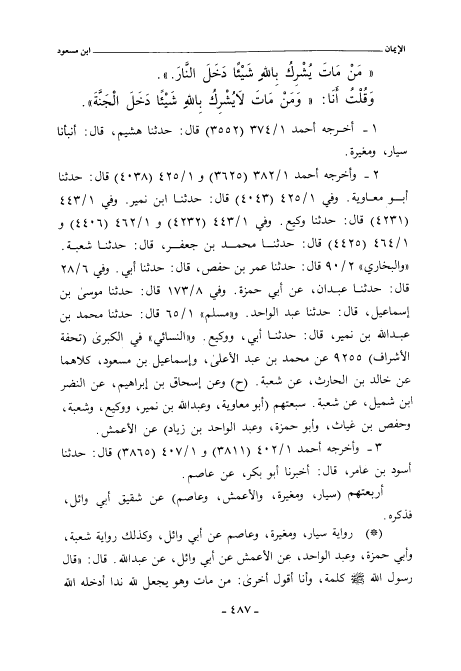 أخرجه أحمد ١/ ٣٧٤ (٣٥٥٢) قال: حدَّثنا هشيم، أنبأنا سيار، ومغيرة. وفي ١/ ٣٨٢ (٣٦٢٥) و ١/ ٤٢٥ (٤٠٣٨) قال: حدَّثنا أبو معاوية، حدَّثنا الأعمش. وفي ١/ ٤٠٢ (٣٨١١) و ١/ ٤٠٧ (٣٨٦٥) قال: حدَّثنا أسود بن عامر، أَخْبَرنا أبو بكر، عن عاصم. وفي ١/ ٤٢٥ (٤٠٤٣) قال: حدَّثنا ابن نمير، حدَّثنا الأعمش (قال أحمد بن حنبل عقبه: ووافقه أبو بكر، عن عاصم، خلاف أبي معاوية، حدثناه أسود) وفي ١/ ٤٤٣ (٤٢٣٠) قال: حدَّثنا وكيع، حدَّثنا الأعمش. وفي ١/ ٤٤٣ (٤٢٣١) و ١/ ٤٦٢ (٤٤٠٦) (٦) و ١/ ٤٦٤ (٤٤٢٥) قال: حدَّثنا محمد بن جعفر، حدَّثنا شعبة، عن سليمان. و) البخاري) ٢/ ٩٠ (١٢٣٨) قال: حدَّثنا عمر بن حفص، حدَّثنا أبى، حدَّثنا الأعمش. وفى ٦/ ٢٨ (٤٤٩٧) قال: حدتنا عبدان، عن أبي حمزة، عن الأعمش. وفي ٨/ ١٧٣ (٦٦٨٣) حدثنا موسى بن إسماعيل، حدَّثنا عبد الواحد، حدَّثنا الأعمش. و) مسلم) ١/ ٦٥ (١٨١) قال: حدَّثنا محمد بن عبد اللهِ بن نمير، حدَّثنا أبي، ووكيع، عن الأعمش. و"النَّسائي" في "الكبرى" ١٠٩٤٤ قال: أَخْبَرنا إسحاق بن إبراهيم، أَخْبَرنا النضر بن شميل، حدَّثنا شعبة، عن سليمان (ح) وأخبرنا محمد بن عبد الأعلى، وإسماعيل بن مسعود، قالا: حدَّثنا خالد، وهو ابن الحارث، حدَّثنا شعبة، عن سليمان