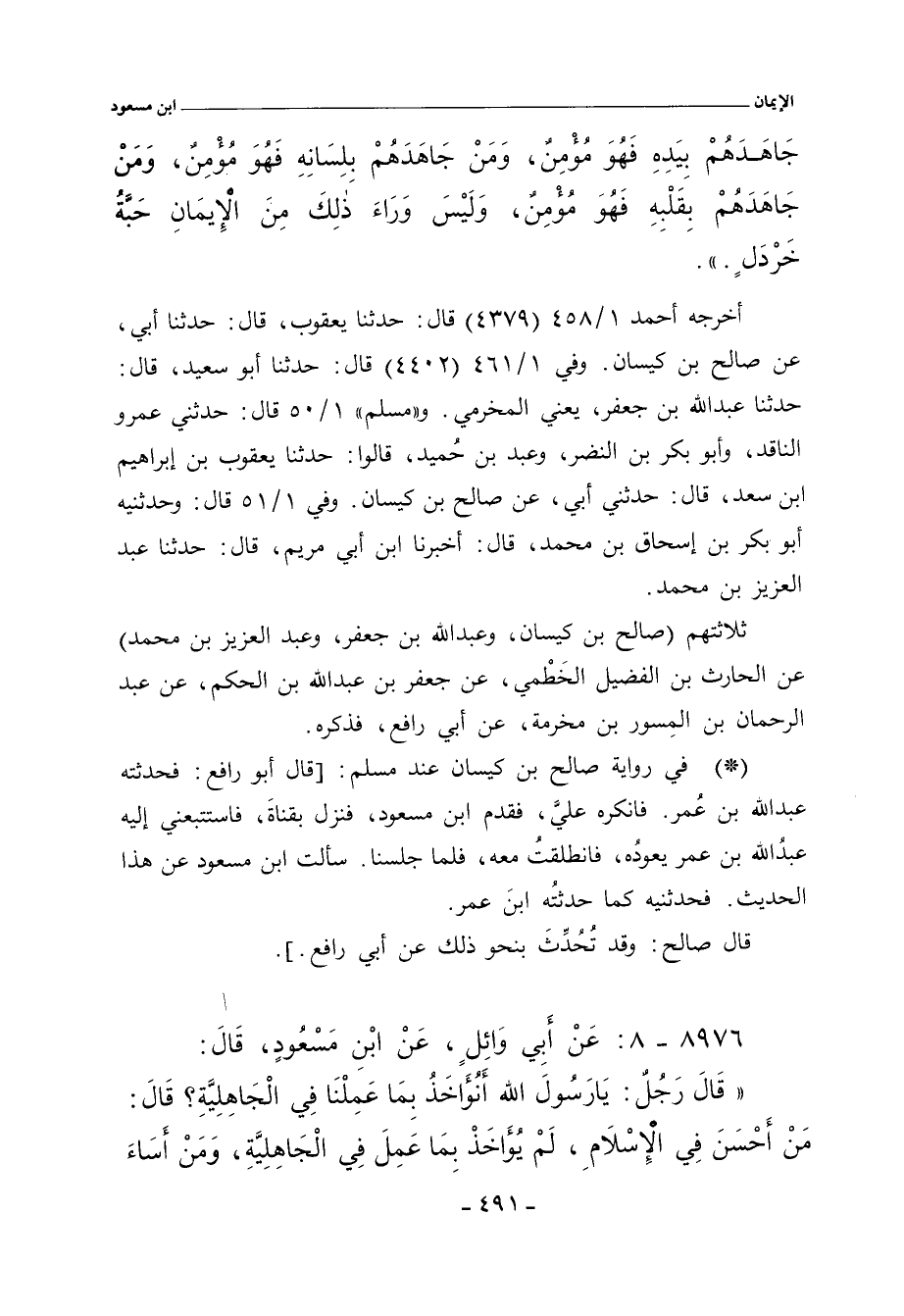 أخرجه أحمد ١/ ٤٥٨ (٤٣٧٩) قال: حدَّثنا يعقوب، حدَّثنا أبي، عن صالح بن كيسان. وفي ١/ ٤٦١ (٤٤٠٢) قال: حدَّثنا أبو سعيد، حدَّثنا عبد اللهِ بن جعفر، يعني المخرمي. و) مسلم) ١/ ٥٠ (٨٩) قال: حدثني عمرو الناقد، وأبو بكر بن النضر، وعبد بن حُميد، قالوا: حدَّثنا يعقوب بن إبراهيم بن سعد، قال: حدثني أبي، عن صالح بن كيسان. وفي ١/ ٥١ (٩٠) قال: وحدثنيه أبو بكر بن إسحاق بن محمد، أَخْبَرنا ابن أبي مريم، حدَّثنا عبد العزيز بن محمد.