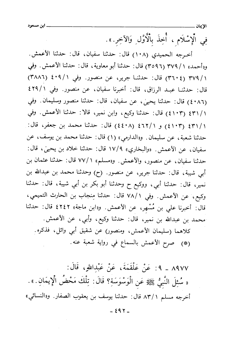 أخرجه الحميدي ١٠٨ قال: حدَّثنا سفيان، قال: حدَّثنا الأعمش. و) أحمد) ١/ ٣٧٩ (٣٥٩٦) قال: حدَّثنا أبو معاوية، حدَّثنا الأعمش. وفي (٣٦٠٤) قال: حدَّثنا جرير، عن منصور. وفي ١/ ٤٠٩ (٣٨٨٦) قال: حدَّثنا عبد الرزاق، أنبأنا سفيان، عن منصور. وفي ١/ ٤٢٩ (٤٠٨٦) قال: حدَّثنا يحيى، عن سفيان، حدَّثنا منصور، وسليمان. وفي ١/ ٤٣١ (٤١٠٣) قال: حدَّثنا وكيع، وابن نمير، قالا: حدَّثنا الأعمش. وفي ١/ ٤٣١ (٤١٠٣) و ١/ ٤٦٢ (٤٤٠٨) قال: حدَّثنا محمد بن جعفر، حدَّثنا شعبة، عن سليمان. و) الدارمي (قال: حدَّثنا محمد بن يوسف، عن سفيان، عن الأعمش. و"البُخَارِي" ٩/ ١٧ (٦٩٢١) قال: حدَّثنا خلاد بن يحيى، حدَّثنا سفيان، عن منصور، والأعمش. و) مسلم) ١/ ٧٧ (٢٣٣) قال: حدَّثنا عثمان بن أبي شيبة، حدَّثنا جرير، عن منصور. وفي (٢٣٤) قال: حدَّثنا محمد بن عبد اللهِ بن نمير، حدَّثنا أبي، ووكيع (ح) وحدَّثنا أبو بكر بن أبي شيبة، حدَّثنا وكيع، عن الأعمش. وفي ١/ ٧٨ (٢٣٥) قال: حدَّثنا مِنجاب بن الحارث التميمي، أَخْبَرنا علي بن مُسْهِر، عن الأعمش. و) ابن ماجة) ٤٢٤٢ قال: حدَّثنا محمد بن عبد اللهِ بن نمير، حدَّثنا وكيع، وأبي، عن الأعمش.